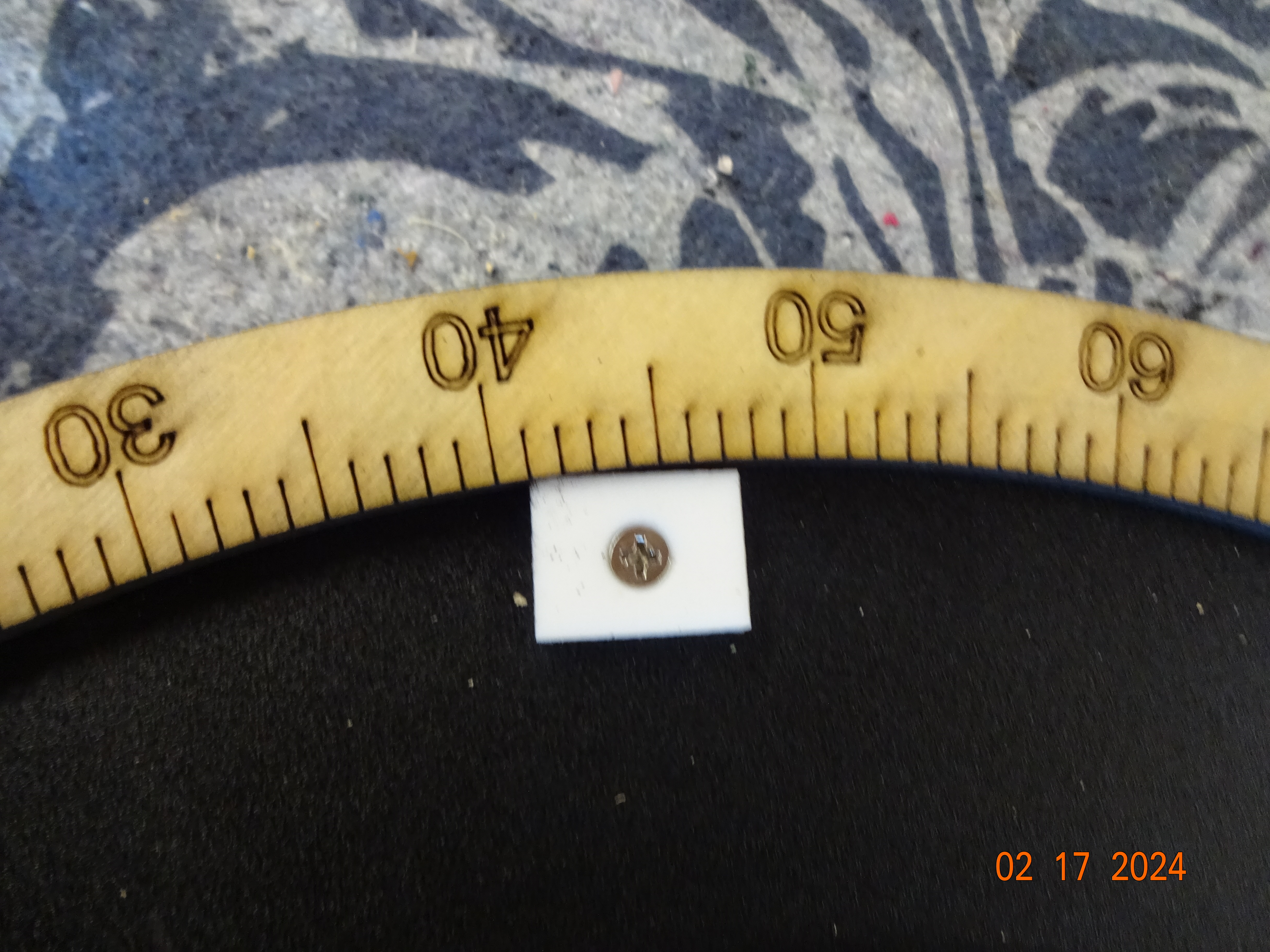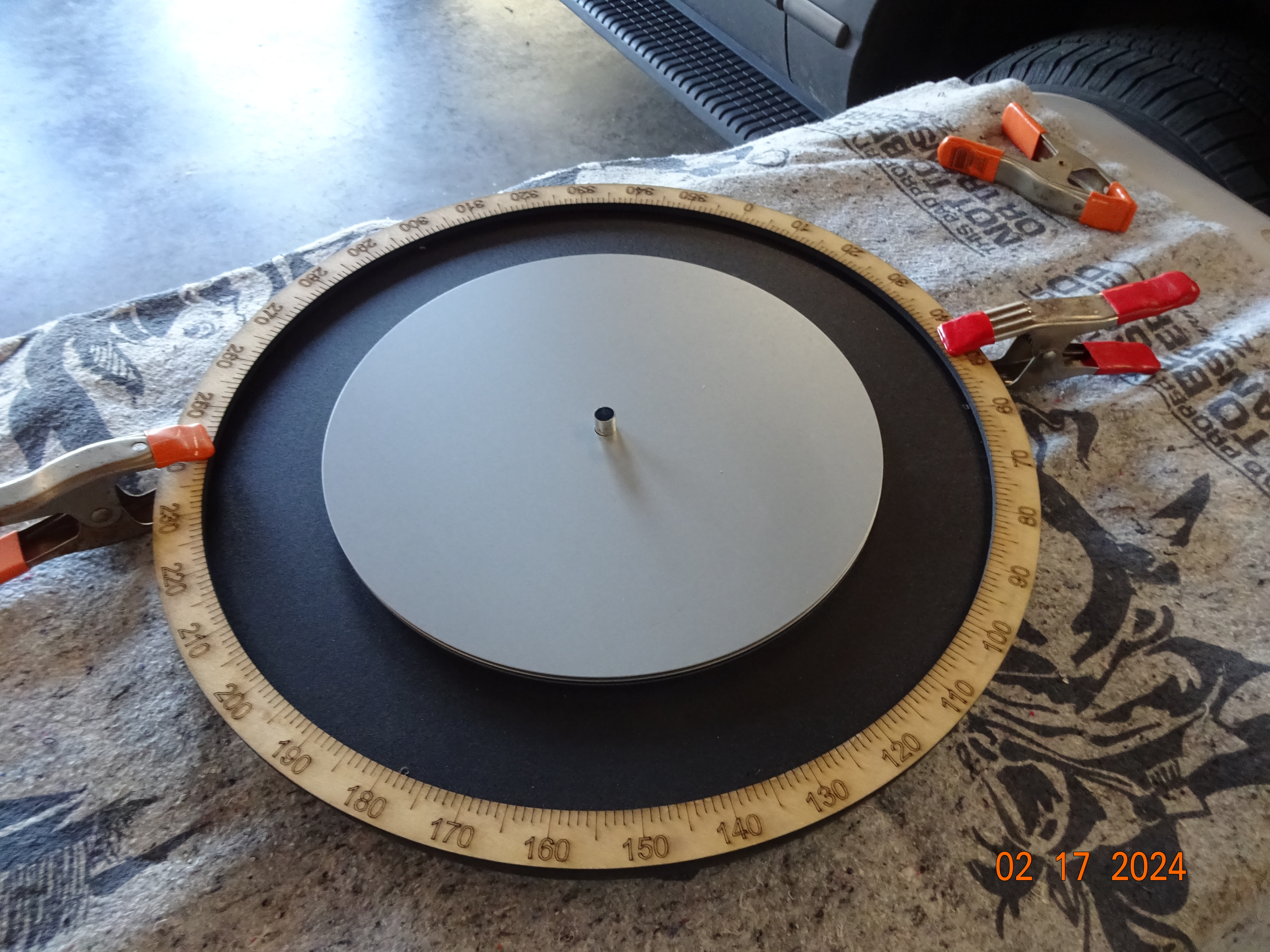 This photo shows for 5mm Teflon pads I had left over from another project. I laid them evenly around the inside of the circle to (1) hold it in place and (2) put friction on the circle so, after I set it, it would stay in place until I moved it. The circle hangs over the ground board about 1/8 inch, which is enough for me to grip it and move it.