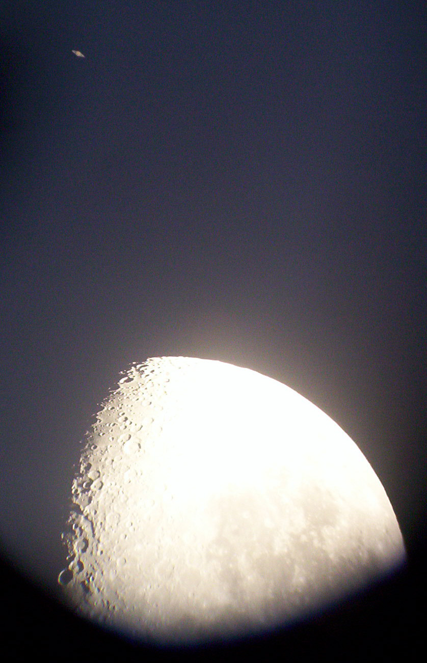 Another photo -- neither Saturn nor the Moon is as clear as in the top photo. Note that this photo is lighter than the one above. In the top photo, the camera was held close to the eyepiece and the rubber eye guard around the eyepiece blocked sunlight. In the lower photo, the camera was not up against the rubber eye guard and sunlight entered the camera.