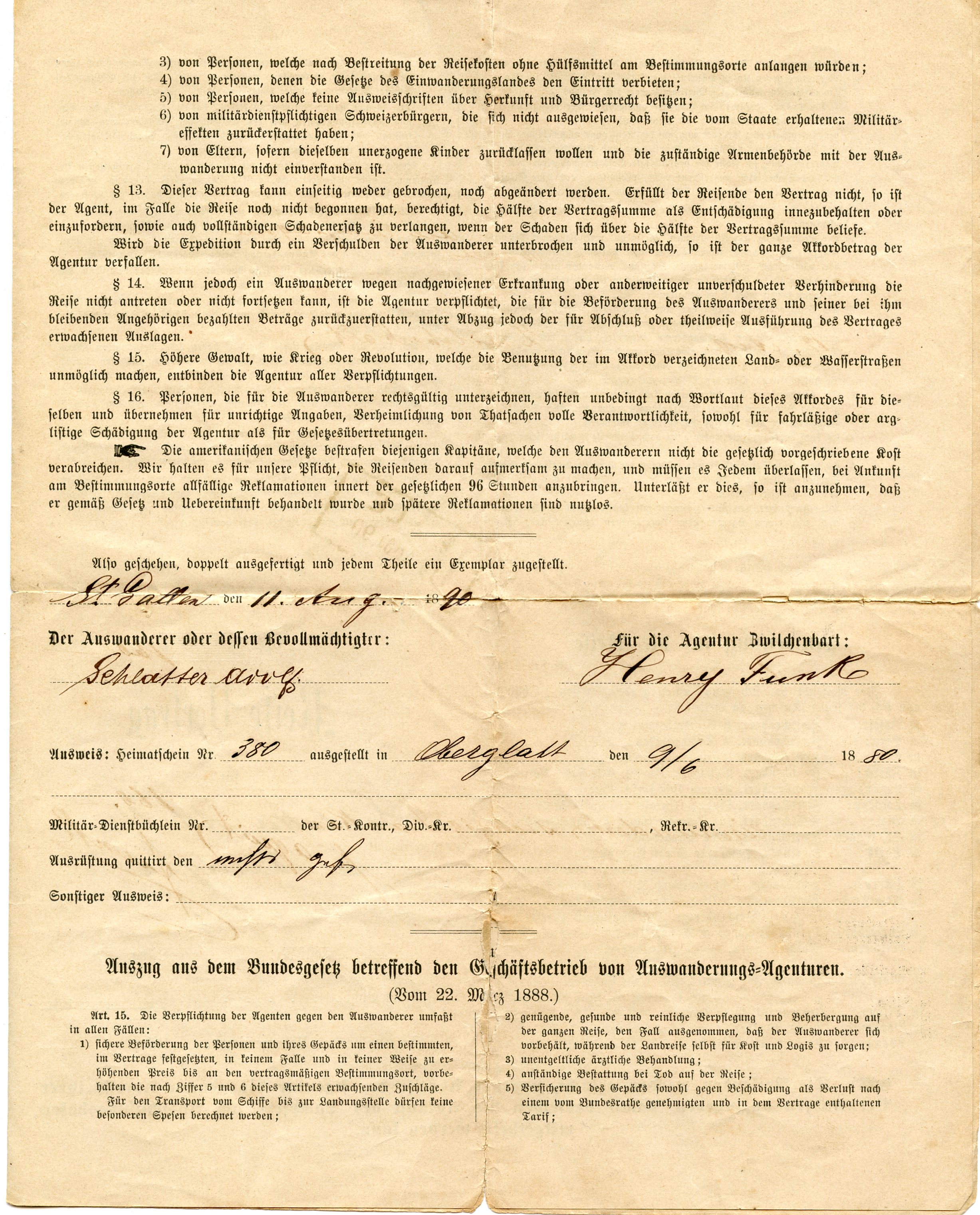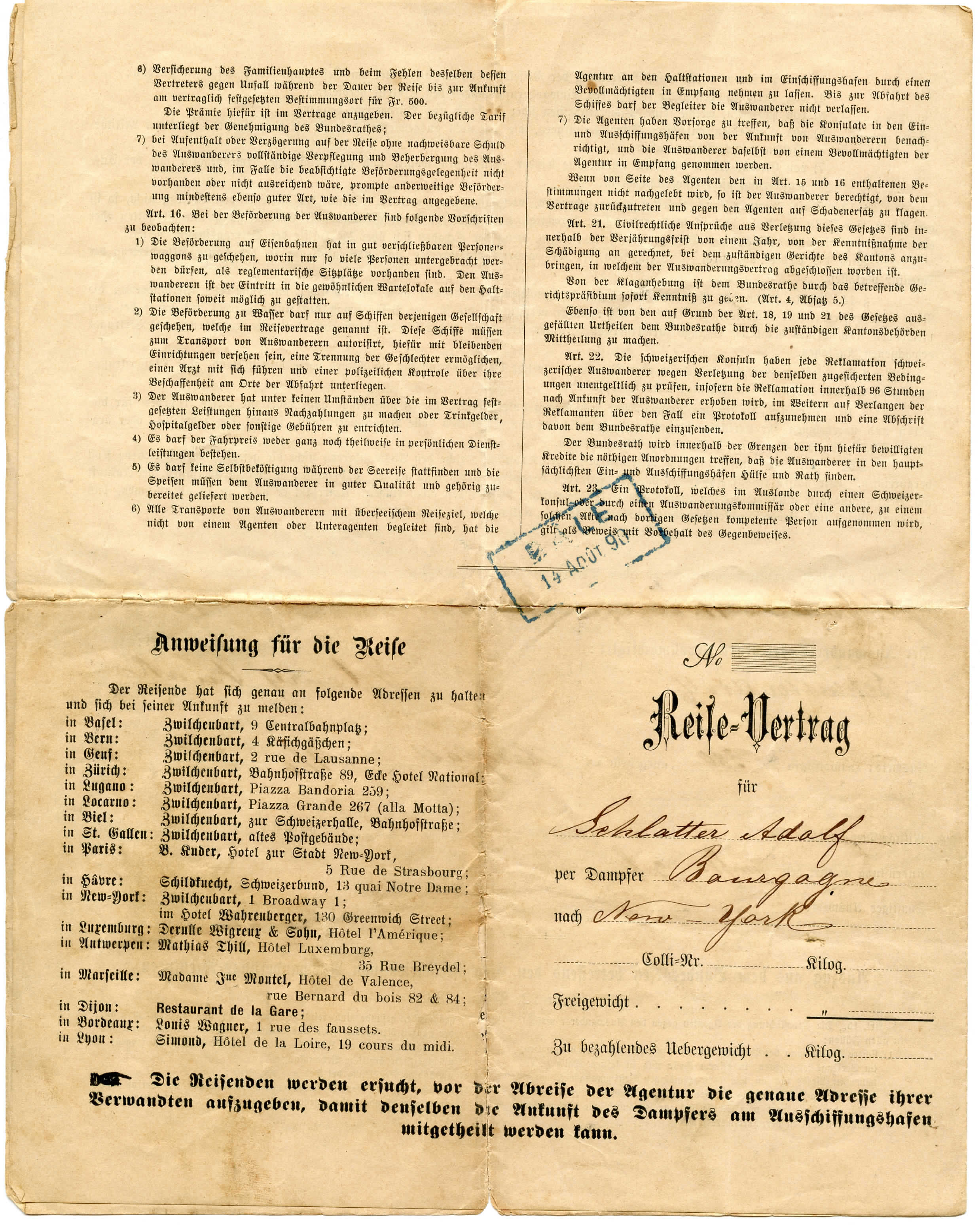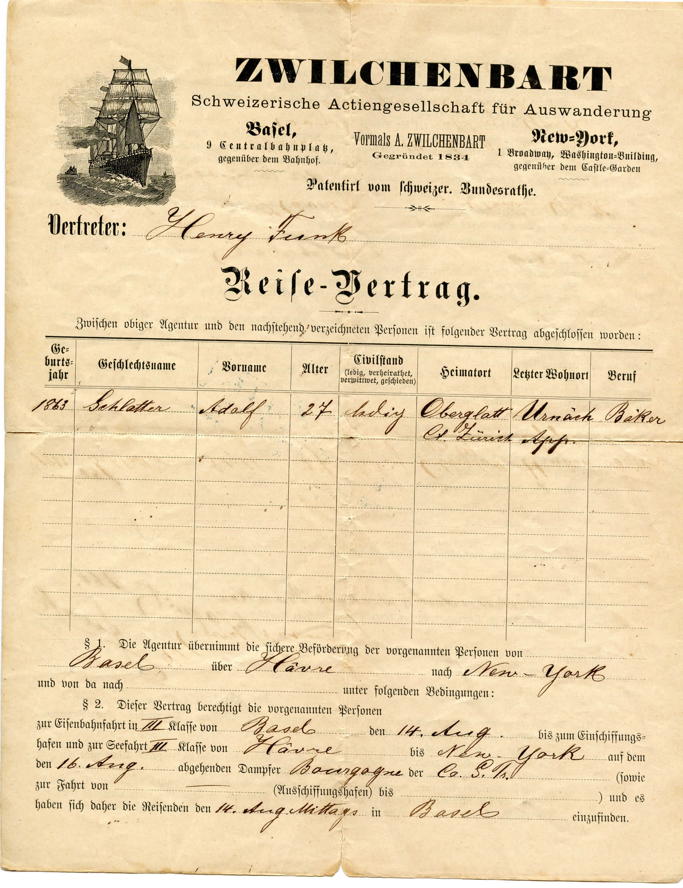 Information on this document is the same as entries made by Adolph Schlatter on his application for U.S. citizenship that he completed 27 March 1923. He stated that he first entered the U.S. on 24 August 1890 on the ship “Bourgoine,” from Basel, Switzerland, by way of Havre, France.
