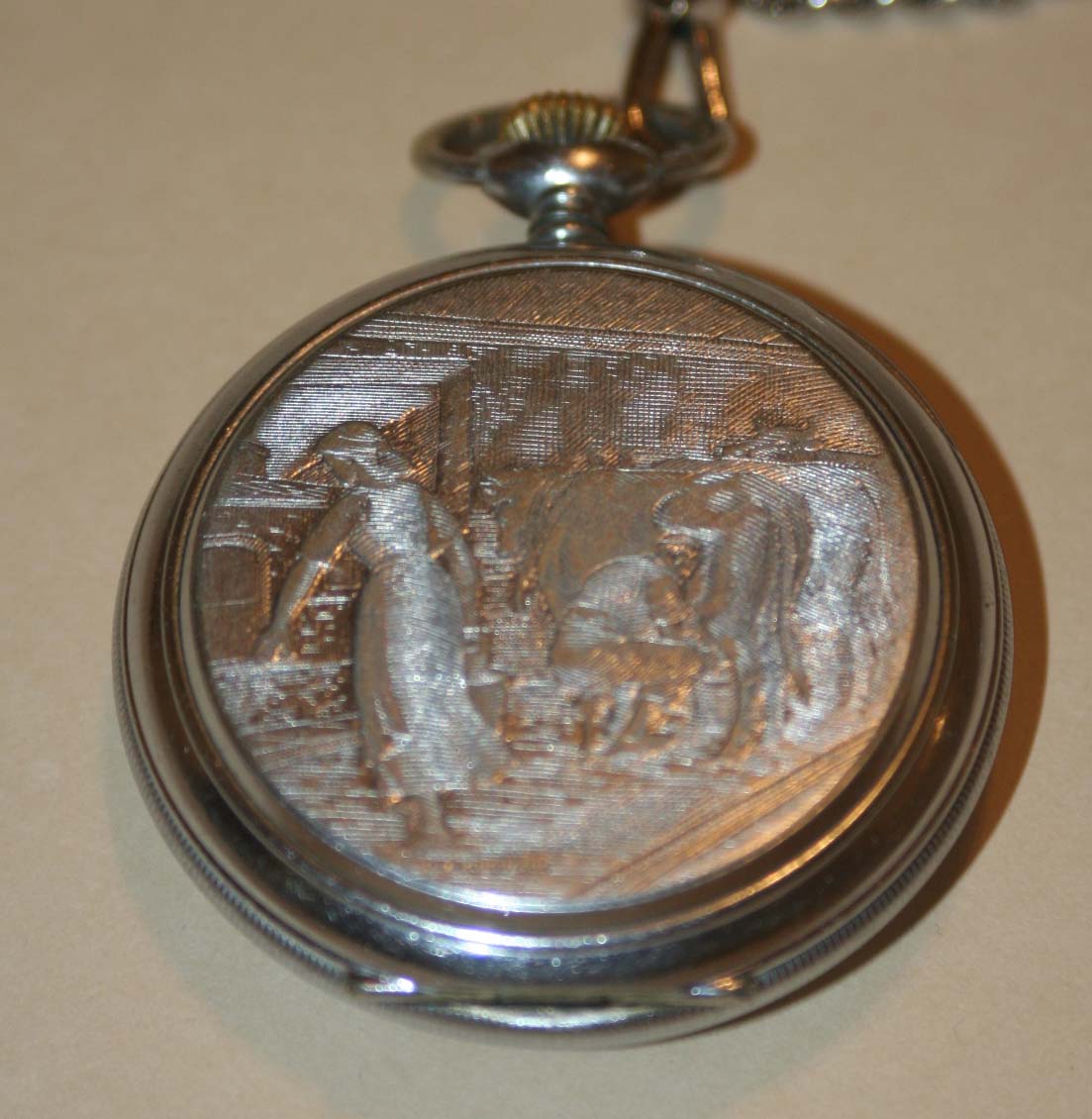 The back of the watch is decorated with a bas-relief scene of a man, a woman,