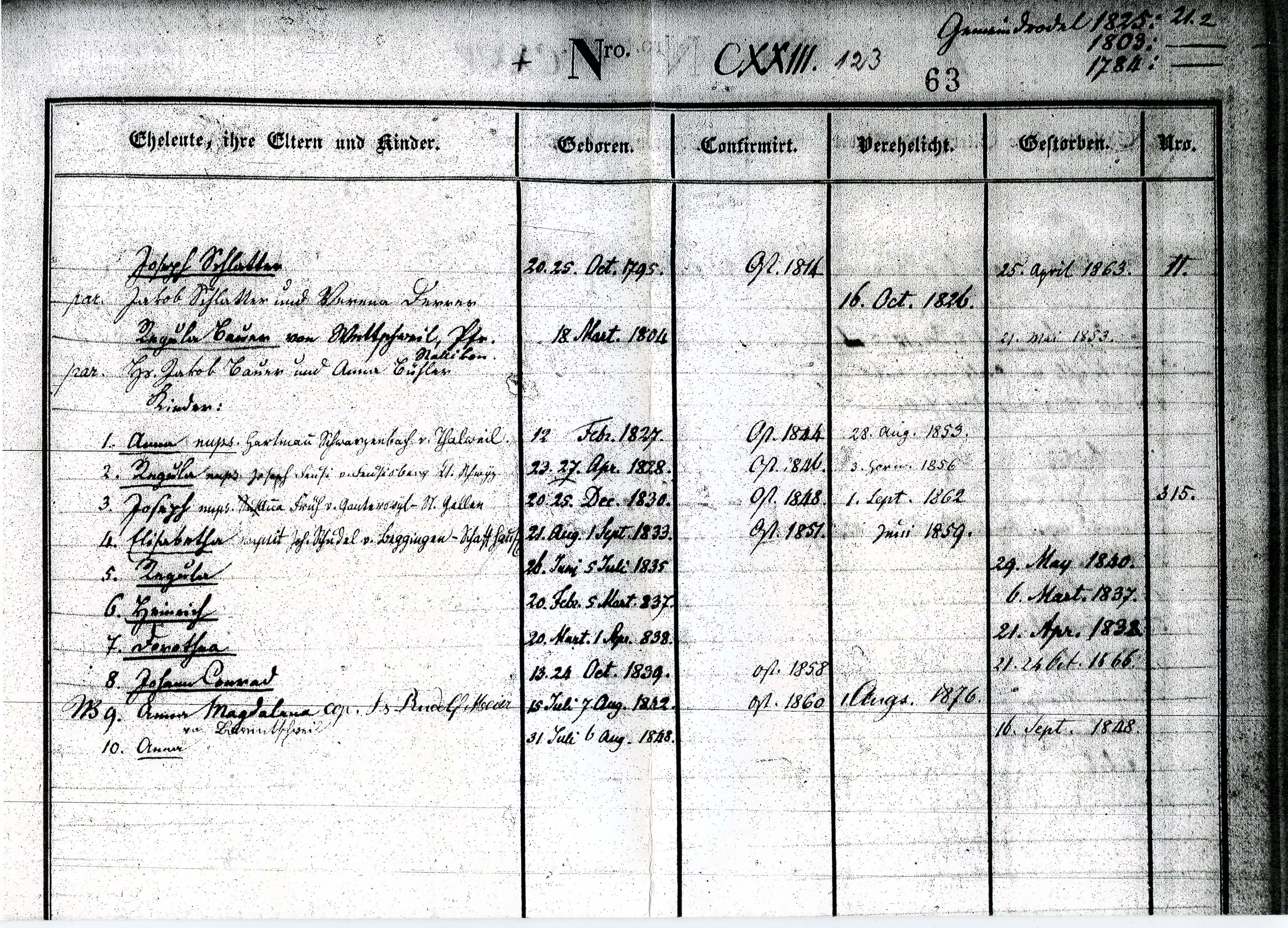 Josef Schlatter is my great-great-grandfather. His parents, Jakob Schlatter and (illegible), are my great-great-great-grandparents.
