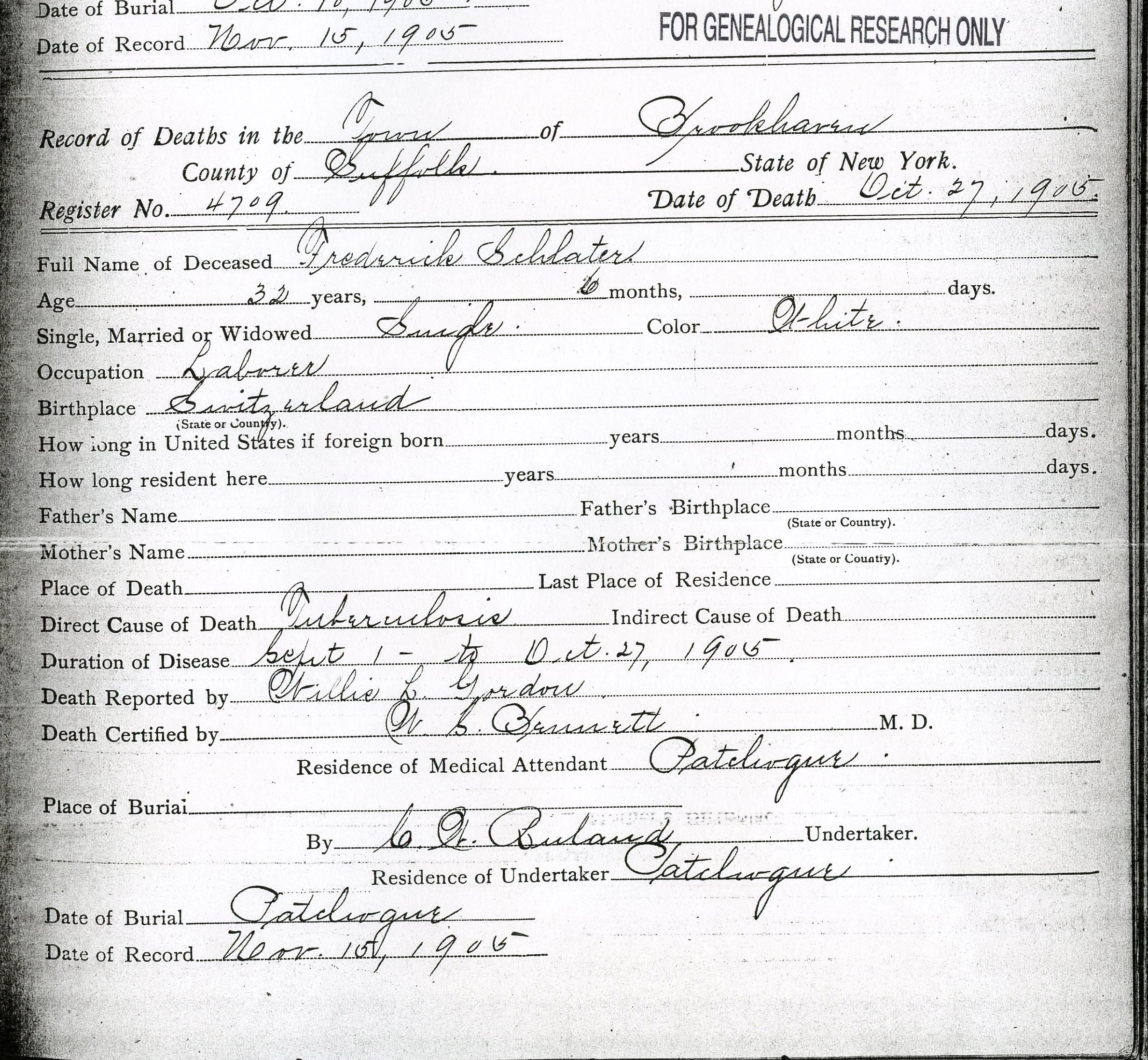Alfred Schlatter died in Long Island, NY, on 27 October 1905. We know this man is Adolph's brother because of the letters from Fred and his landlady. According to the obituary, he was 30 years old, which places his birth in 1875. However, the death certificate gives his age as 32 years, 6 months, in October 1905, which places his birth date in April 1873.