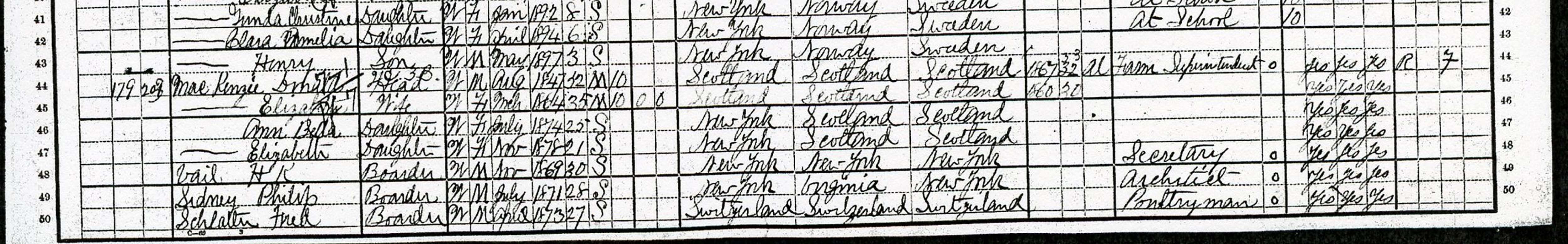 The landlady in 1905 is Mrs. M. L. Gordon. On this census form, the head of the household -- who would have been the landlord/landlady, is named MacKenzie, NOT Gordon. Of course, Fred could have lived with the MacKenzie's in 1900, then, moved to live with the Gordon's in 1901.