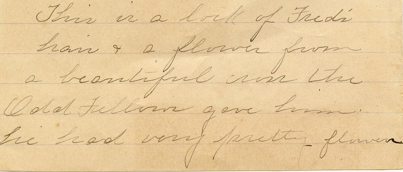 In the note from Fred's landlady written to Fred's brother Adolph, after Fred's death, the landlady writes: " This is a lock of Fred's hair & a flower from a beautiful cross the Odd Fellows gave him. He had very pretty flowers. "