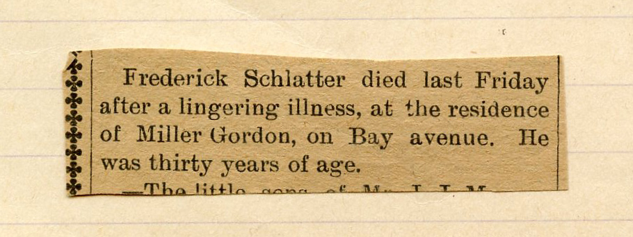 Alfred Schlatter's obituary notice (Name is incorrectly listed as "Frederick.")