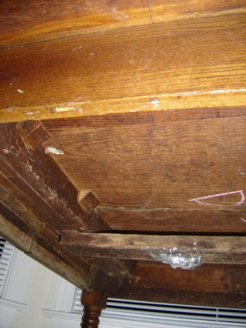 A close-up view of one leg of the Dudding Dining Room Table. View of the underside of the table. The chalk mark was applied by my grandmother, Annie Lee Dudding Richardson, to help her remember which table leaf went where. The plastic wrapped around the center beam contains steel feet that came off the bottom of the legs -- we wrapped them like this so we would not lose them. History of the Dudding Dining Room TableThe following history of the “Dudding dining room table” was related by Annie Lee Richardson Schlatter (b. 1924, d. 2007) to her son, Joseph A. Schlatter, Jr., and her daughter-in-law, Rose G. Schlatter, at her home in Knoxville, TN, on 26 February 2007. Annie Lee Richardson Schlatter is the daughter of Annie Lee Dudding Richardson and Clarence James Richardson, Sr. Annie Lee Dudding Richardson is the daughter of Nina Anna Statia White Dudding (AKA: “Nanny,” “Miss Dollie,” “Dollie”) and Maurice (AKA: Morris) Dudding. Maurice Dudding is the son of James J. Dudding and his first wife, Margery McCallister. James J. Dudding: born 3 (or 13) Dec 1846, Winfield, Putnam County, WV; died 19 Feb 1913, East Feliciana Parish, LA. Margery McCallister: b. 1846, Hurricane, Putnam County, WV; died: unknown. James J. Dudding and Margery McCallister were married 1866 in Cabell County, WV. They had two children, Cora Dudding, born 6 Aug 1866, and Maurice Dudding, born 6 Mar 1869 in Putnam County, WV. After the death of his first wife (Margery McCallister, d. unknown), James J. Dudding married Maggie Virginia Spotts, born 11 Nov 1849, in Louisiana, died 15 Nov 1922, in East Feliciana Parish, LA. James J. Dudding and Maggie Virginia Spotts had seven children. The first child was born in 1871 in WV; the second child was born in 1873 in Louisiana. Thus, James J. Dudding, Maggie Virginia Spotts Dudding, and three children moved from WV to Louisiana between 1871 and 1873. Maurice Dudding (born 6 March 1869) married Nina Anna Statia White (born 16 Nov 1872; AKA: Nanny). According to stories told by Nanny, the Dudding family left Putnam County, WV, by “flatboat” on the Ohio River. They traveled down the Ohio River, to the Mississippi River, landing at Saint Francisville, LA, then traveled by oxcart to East Feliciana Parish, LA, where they settled near the current town of Norwood.