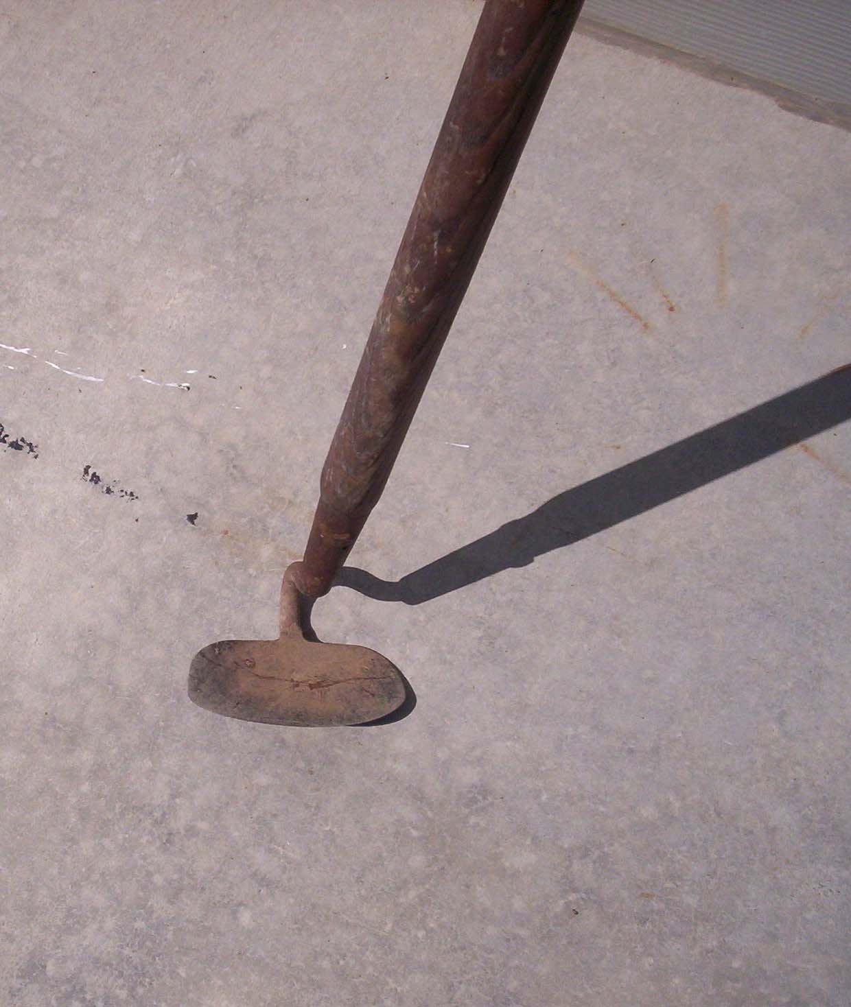 First, let's explain the purpose of a "grubbing hoe." In Southern parlance, "to grub" means to use a hoe to remove weeds or to lightly cultivate the soil in a flower bed or vegetable garden. Most Southern ladies owned a grubbing hoe that they used for light garden work. Heavy garden work was done by a hired hand -- in most every case a black man -- but ladies took pride in keeping their flower beds and kitchen gardens weed-free. Because the yard man usually came only once or twice a week, the lady of the house had to keep the weeds out of the beds and garden between visits by the yard man. Strictly speaking, a "grub hoe" is a heavy tool used for digging and heavy clearing. The grubbing hoe used by a Southern lady was not a heavy tool. Instead, it was a normal garden hoe that had been filed down to make the blade smaller and very sharp so it would cut off weeds at ground level. Here are two photos of Momma Richardson's Grubbing Hoe. Photos were made at our home in Northumberland County, VA, in May 2011.