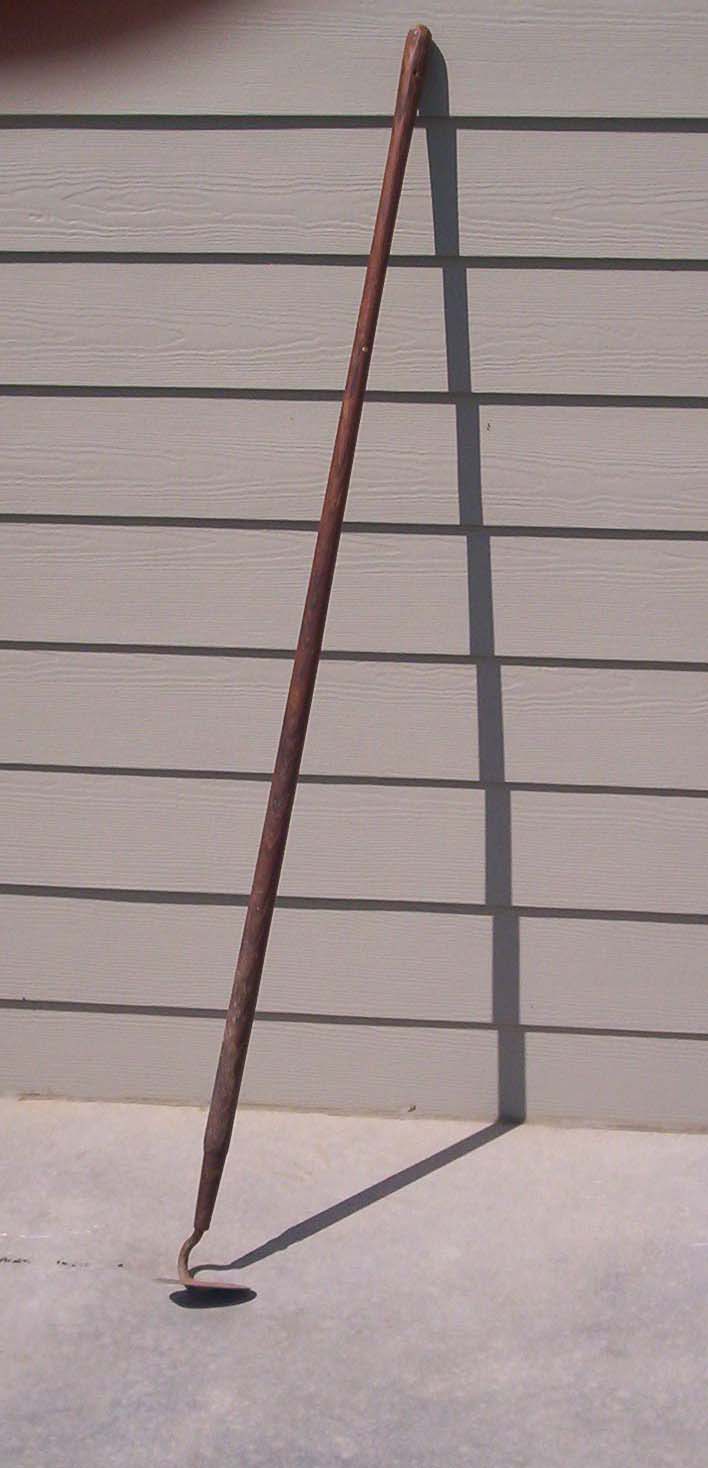 Note the head of the hoe -- it is much smaller than a normal garden hoe, is slightly curved, and is sharpened along it's edge. According to Joe's mother, Nanny -- Joe's great-grandmother -- obtained this hoe sometime between 1903 and 1905 when she and "Mr. Dudding" moved into the village of Norwood, LA. This is the original hoe - neither the handle nor the head have been replaced. Twice a year Joe rubs the wooden handle with linseed oil to keep it from drying out. After each use, Joe cleans and sharpens the head then gives the head a light coat of motor oil to keep it from rusting. We are careful to use this hoe for only very light garden work, mainly lightly chopping weeds out of our flower beds and garden. There is a Faulkner novel in which two of the characters -- a Southern lady and her yard man -- talk often about weeding the petunia bed. At least one passage in this novel describes the lady's hoe. I'll try to find that passage and add it to this page.