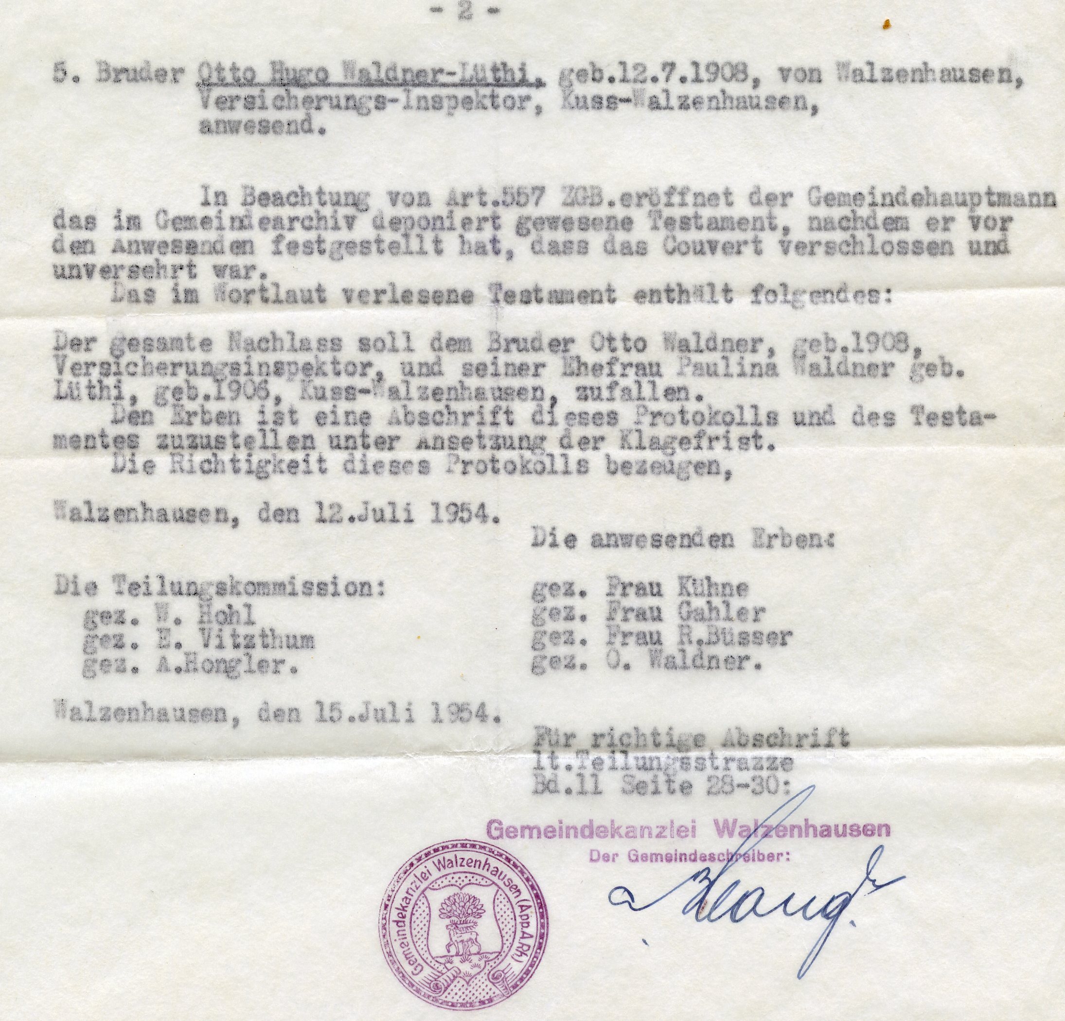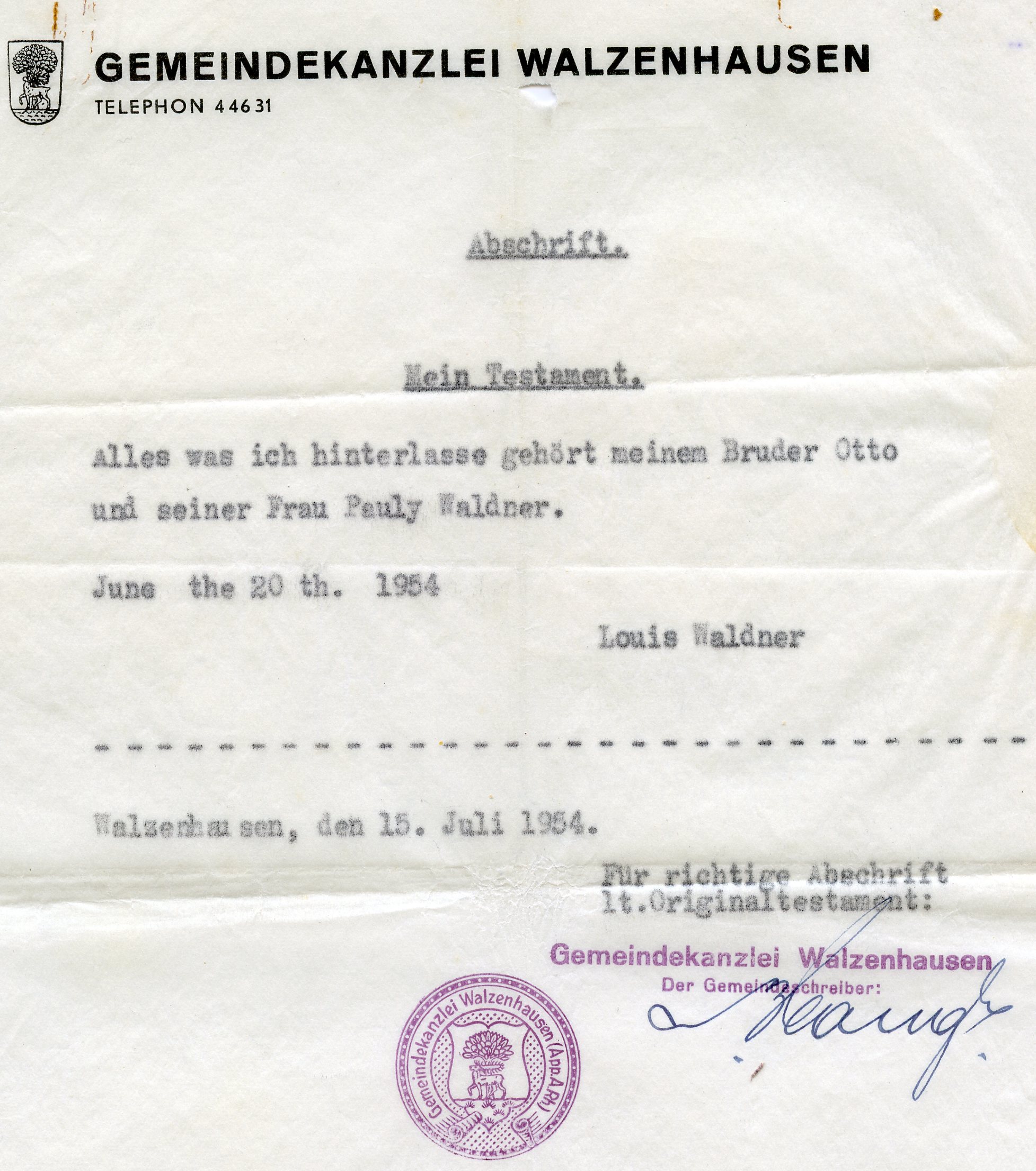 Most of the information we have about the Waldner family comes from a letter written to my father after Louis' death in 1954. Louis returned home to Switzerland sometime in the early 1950's; possibly the late 1940's. He died in July 1954 and, when his estate was settled, an attorney in Switzerland sent a letter to all family members. My father and his brothers, John and Fred, were Louis' nephews -- sons of Louis' sister Emma. We lived in Knoxville, TN, when this letter arrived -- my father is the "Herrn Josef Schlatter" to whom the letter is addressed. The following photos are of the letter; the letter lists: