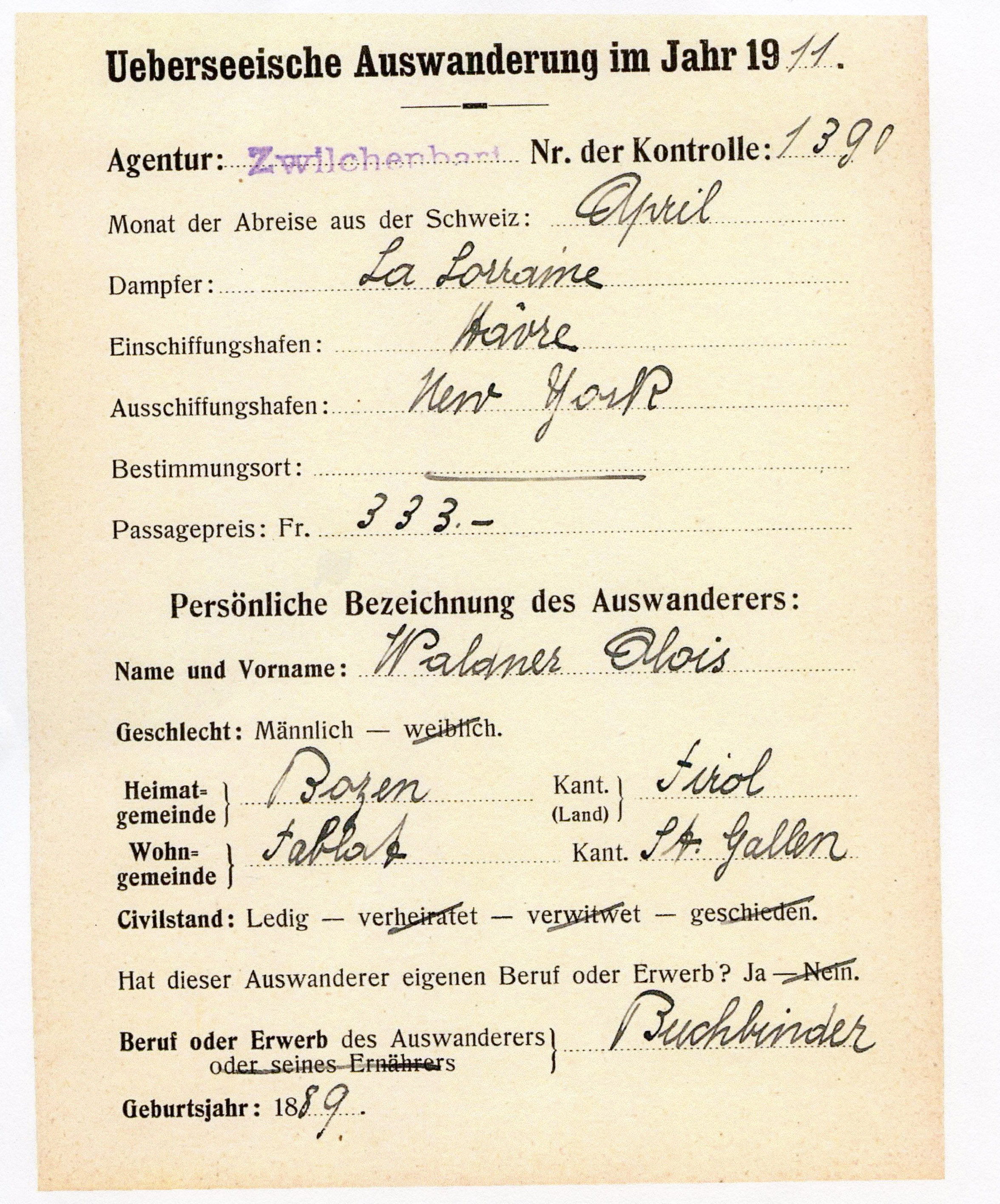 Most of this document is self-explanatory, even if you don't read German. Alois Waldner departed Havre (France) in April 1911 on the vessel La Lorraine bound for New York. His passage cost 333 francs. He was born in Bozen, Tirol (Austria) and lives now in the town of Tablok (?) in St. Gallen (a Canton of Switzerland). His marital status (Civilstand) is Single (Ledig). His occupation is listed as Bookbinder -- something that we did not know. He was born in 1889. My paternal grandparents -- Adolph Schlatter and Emma Waldner -- arrived in the US in October 1910. I searched the database for them using their names and variations on their names but found no records, I assume because the records may not be complete, or, may start after October 1910.