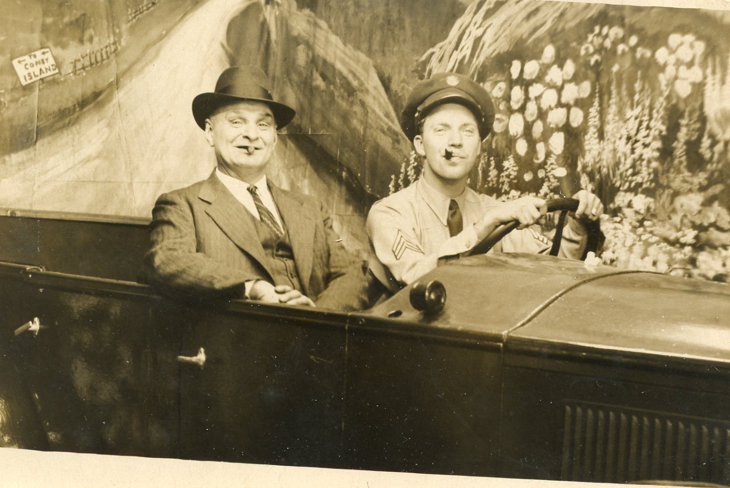 My mother was our family historian. In her collection of family "stuff" were photos that I believe show members of the Waldner family in Switzerland -- here's a link to the first of two Waldner family photo pages. Here's another photo of Louis. Louis is on the left. On the right is my father's younger brother, Fred Schlatter (b. 1921, d. 2010). The photo was taken in Coney Island, obviously staged at a souvenir photo booth, during or after WW II. Fred enlisted in August 1942 and was discharged in February 1946 at Ft. Devens, MA. Louis' wife in Shaw, MS, died in August 1944. Thus, it's possible this photo was made sometime between Louis' wife's death and Fred's discharge.