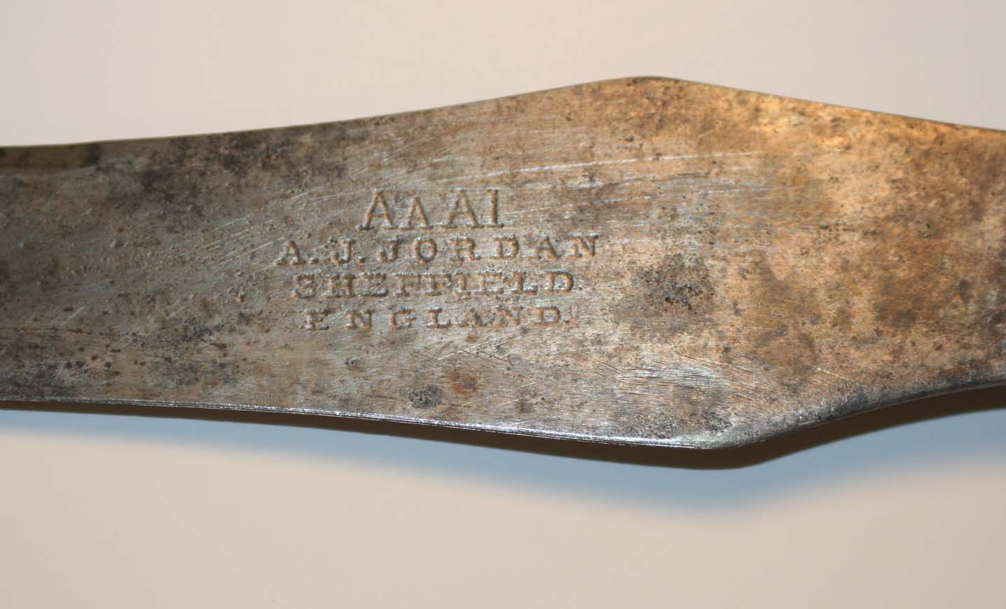 It appears from the two Internet sources quoted above that this set was manufactured in Sheffield, England, by A. J. Jordan's factory and shipped to the US for sale through his distribution center in Saint Louis. The auction listing states the AAA1 mark was first used in 1886. I found several Internet references indicating Jordan's knives were imported until 1926. If A. J. Jordan imports stopped in 1926, there still could have been knives and carving sets for sale afterwards from stock on hand before 1926. Thus, this carving set could have come into my family's possession anytime after 1886.