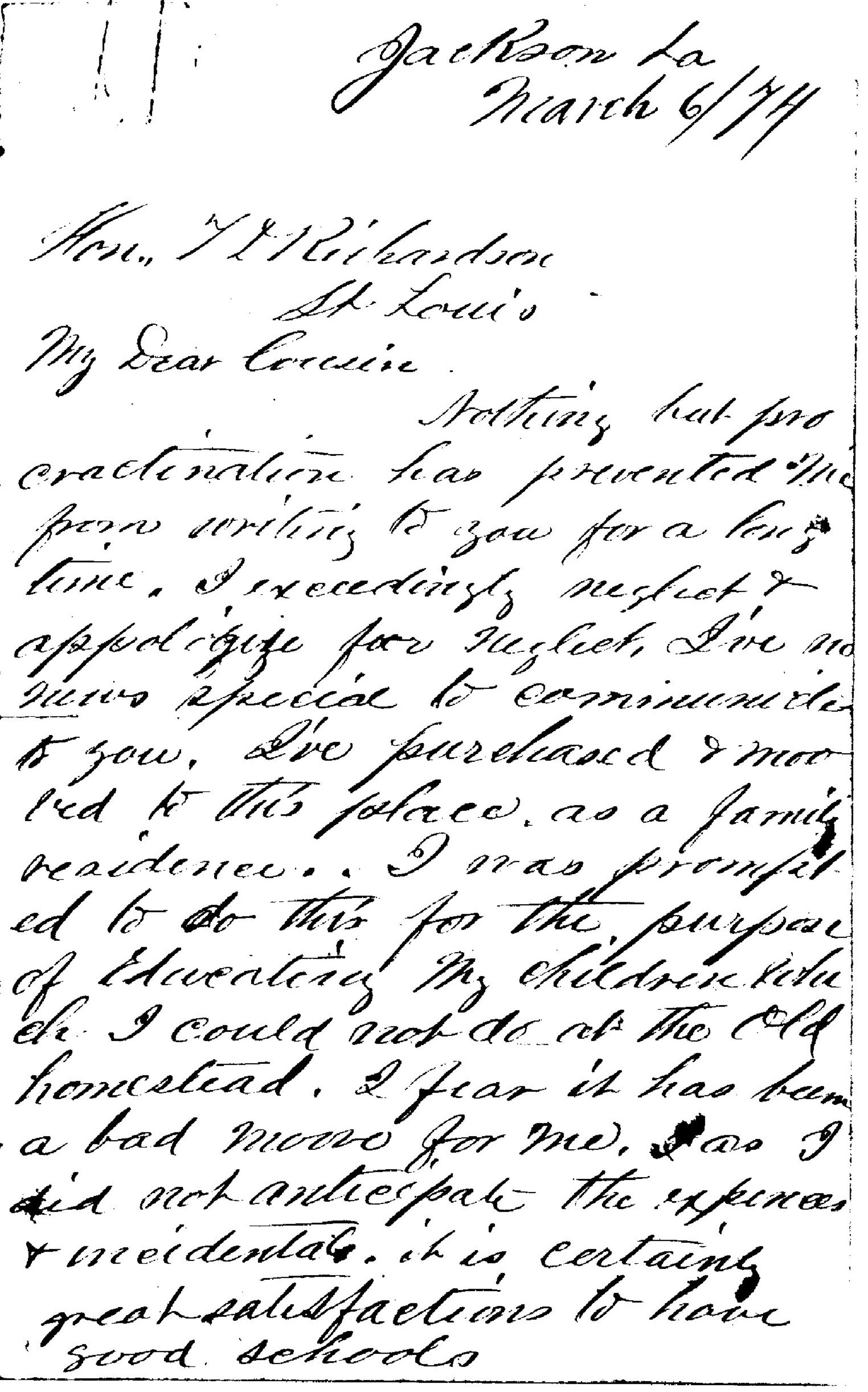 Jackson La Hon. F. D. Richardson My Dear Cousin, Nothing but procrastination has prevented me from writing to you for a long time. I exceedingly neglect & apologize for neglect. I’ve no news special to communicate to you. I’ve purchase & moved to this place as a family residence. I was prompted to do this for the purpose of educating my children (illegible). I could not do at the old homestead. I fear it has been a bad move for me as I did not anticipate the expenses and incidentals. It is certainly great satisfactions to have good schools. My hope now is if I can help them at it to have finished scholars. Excuse this scroll I cannot set up nor write as this is done by (three words illegible, may be “? ? nurse’s). I shall perhaps never pen you another line nor see you face to face in the flesh. Uncle Jared has just called on me & told me of your correspondence. I have always loved you Dear Cousin & I part with you with many regrets. I bid you farewell till we meet in that bright & happy land. Affectionately yrs dear P.S. If you get this & choose to answer direct to my son Preston(??) & he will let you know if I am gone. R.R.R.