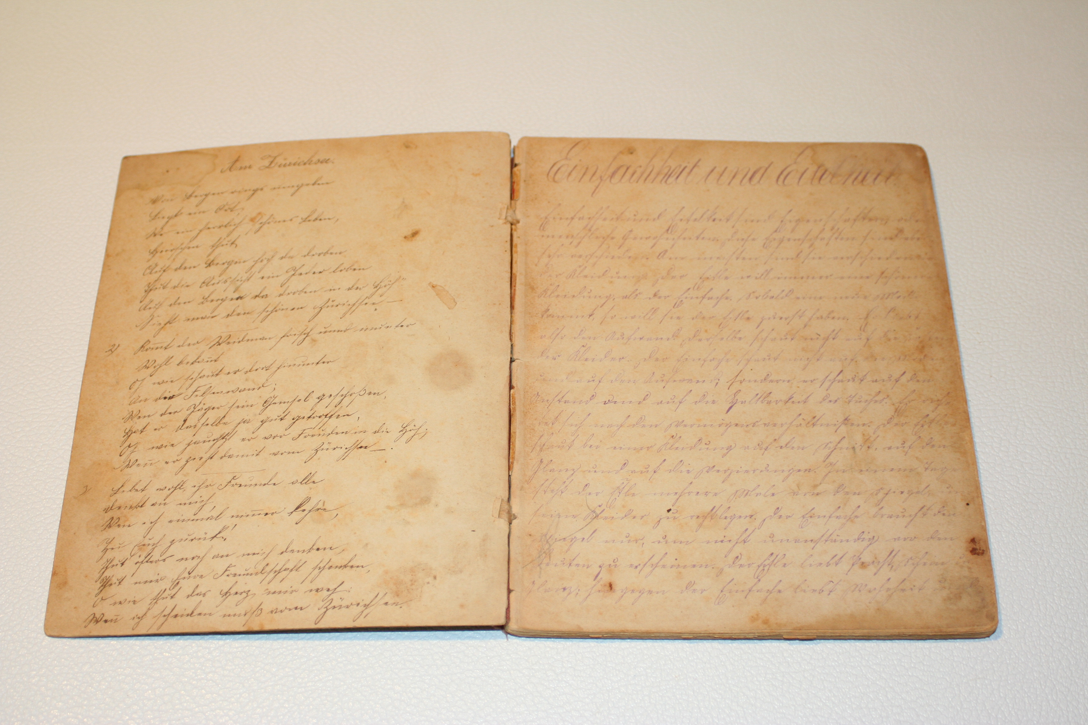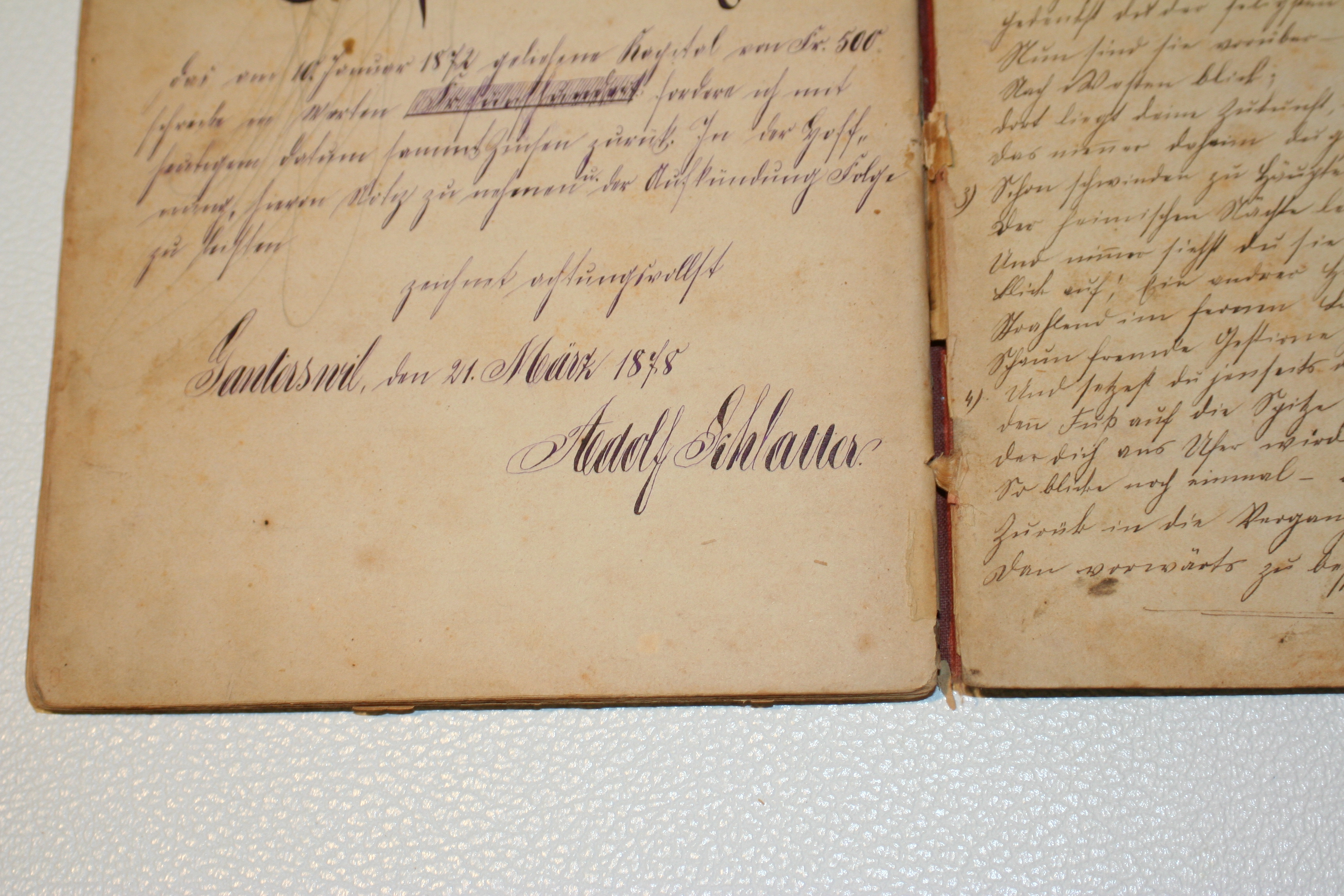Adolph Schlatter JournalBaby had several items that belonged to Adolph that I never saw until she dragged them out just before her death. One of these is a notebook that appears to have been Adolph's -- his name is all over it; dates range from around his 15th birthday forward. It is written in very flowery handwriting with different color inks. The language appears to be high, or, classical German. I have not really examined it in detail but I was able to read some of one entry that is titled "On Lake Zurich." I sent some of these photos to David who showed them to a Swiss engineer who was at their factory. He said this is "Alt Deutch" -- "Old German" and he could not read it. I have thought of trying to find someone to translate it but I'm afraid we could not afford the translation charges, also, I really don't want to let it out of my hands. I started to scan it but that's a lot of work. Instead, I think I'll set up a plain white background and photograph each page. I'll fiddle with the distance, etc., to get a clear image of each page. I can put the digital photos on a CD or thumb drive. Here are photos: