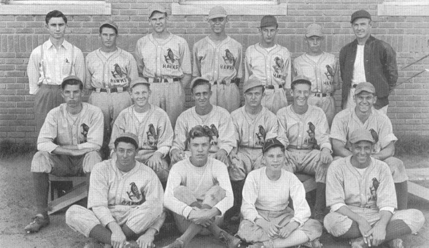 Third from the left on the back row is David M. "Boo" Ferriss, who went on to pitch for the Boston Red Sox. Boo -- as I know him -- compiled a 21-10 record in his rookie season, and followed it with another excellent season in 1946, going 25-6 on the Sox team that won the American League pennant. He started two games for the Sox in the World Series against the St. Louis Cardinals winning one of them, but the Sox lost the series 4-3. His record in 1947 was 12-11. Arm troubles and asthma restricted him to 9 games started in 31 appearances in 1948; by 1950, his playing career was over. Boo Ferriss was the pitching coach for the Red Sox between 1955 and 1959 then became head coach of the Delta State University (Cleveland, MS) baseball program. He guided Delta State to a 639-387 record and three appearances in the NCAA Division II College World Series before retiring in 1988.