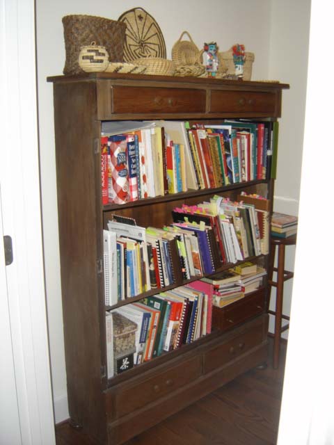The Sullivan Bookcase Made of walnut; 48 inches wide, 63 inches high; marks left by hand planes on the boards. Note the notches in the front edge on the left side of the bookcase -- similar notches are in the same place on the right side -- these notches held hinges for the bookcase doors that were removed at an unknown time. The bun feet at the corners were added by Joe Schlatter, Jr., in 2007.