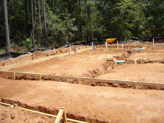 Here are photos. In this picture, you see: (1) the wooden forms that will contain the wet cement as it is poured to make the slab. (2) The footers -- these are the long trenches running front to back and side to side. (3) The plumbing. The waste pipes are the white PVC pipes sticking up here and there and the supply lines are the red and blue pipes sticking up. The supply lines are schedule K copper tubing, 3/4-inch diameter, with red or blue vinyl sleeving pulled over the copper tube to keep the copper out of contact with the dirt and the concrete. The large light-blue-green pipe partially visible just to the right of center is the main waste water line -- it runs from the right side of the house to the left side and all the smaller waste lines feed into it. This line then runs to the sewer connection at the street.
