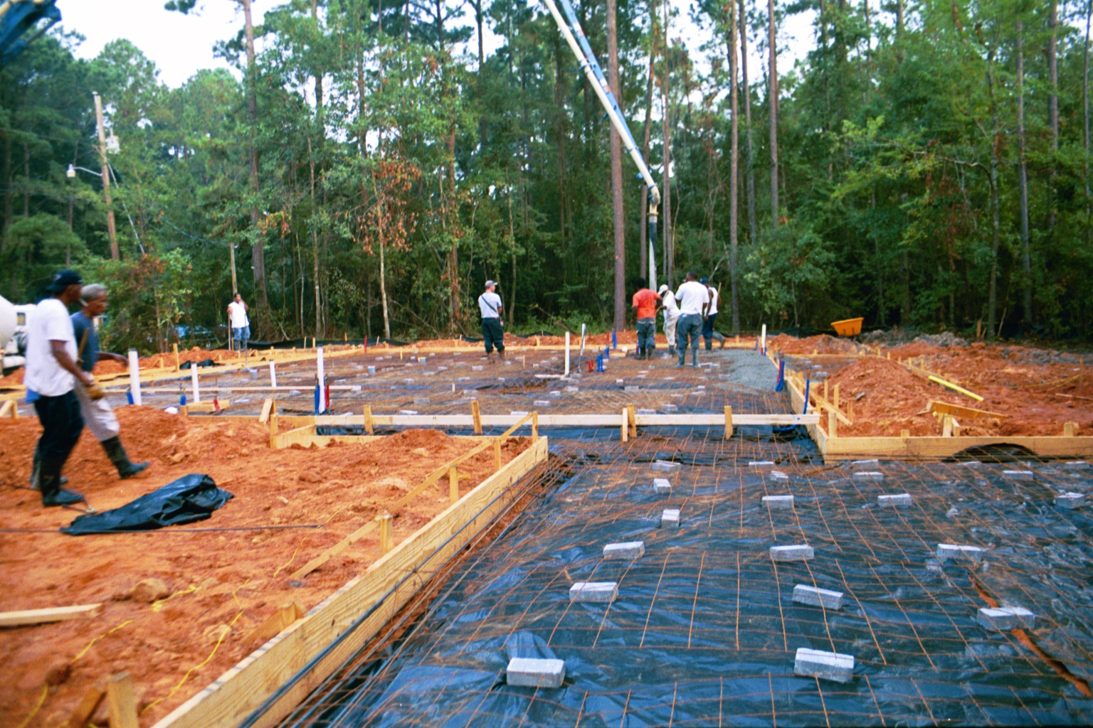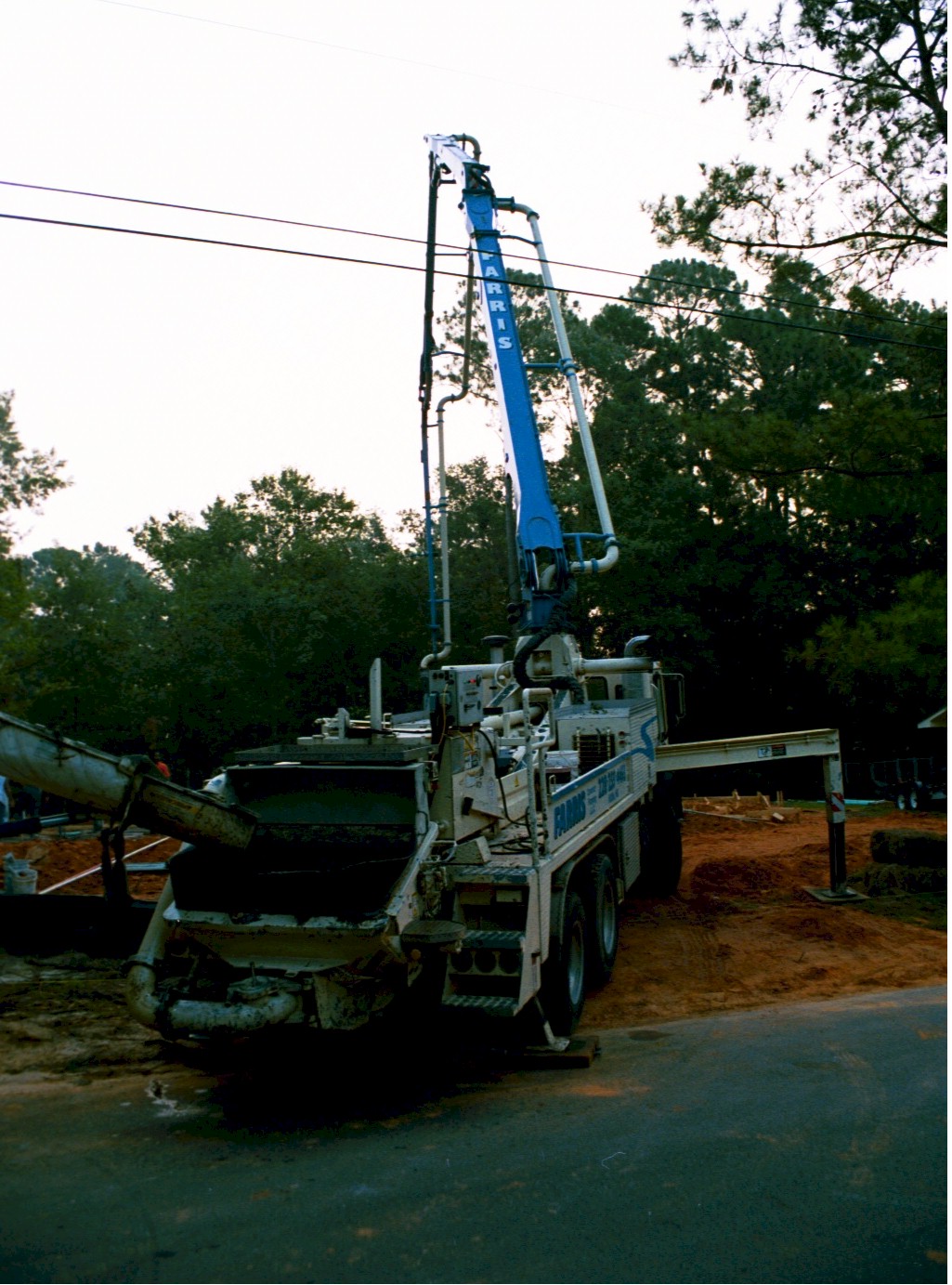 Here is a view of the site with the crew pouring the first footer. All footers are filled with concrete then the slab is poured. Note the pump truck operator; one guy is holding the hose, guiding it to pour into the footer; the rest of the crew is standing by to move concrete to fill any voids.
