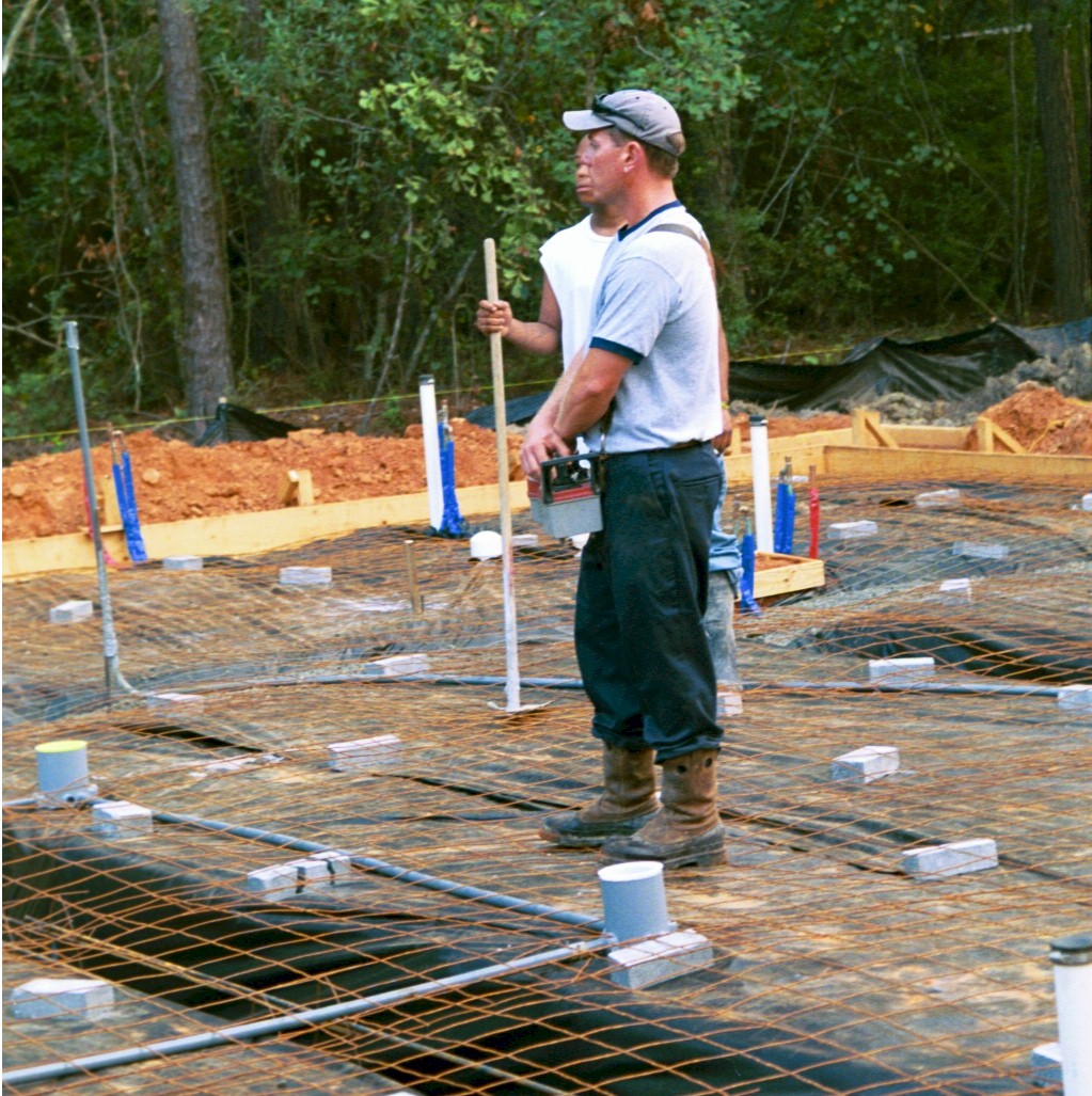 This guy operates the pump truck. He carries with him the wireless remote control that is hanging around his neck -- using this, he controls the pump and the arm, thus, he can move the arm where the crew pouring the concrete wants it as well as starting and stopping the flow of concrete. Note the round object by his left foot, tied to four other similar objects with grey PVC conduit. These are the boxes into which electrical outlets for the floor will be set -- the wires will run through the grey conduit. Before pouring the concrete, the electrician measured exactly where on the floor plan these outlets go then transferred these measurements to the slab and set these boxes and the conduit. The conduit then runs to where a wall will be so he can connect the cables when he wires the house.