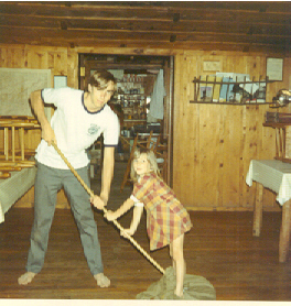 Barbara Brown helps John Schlatter mop the dining room floor.