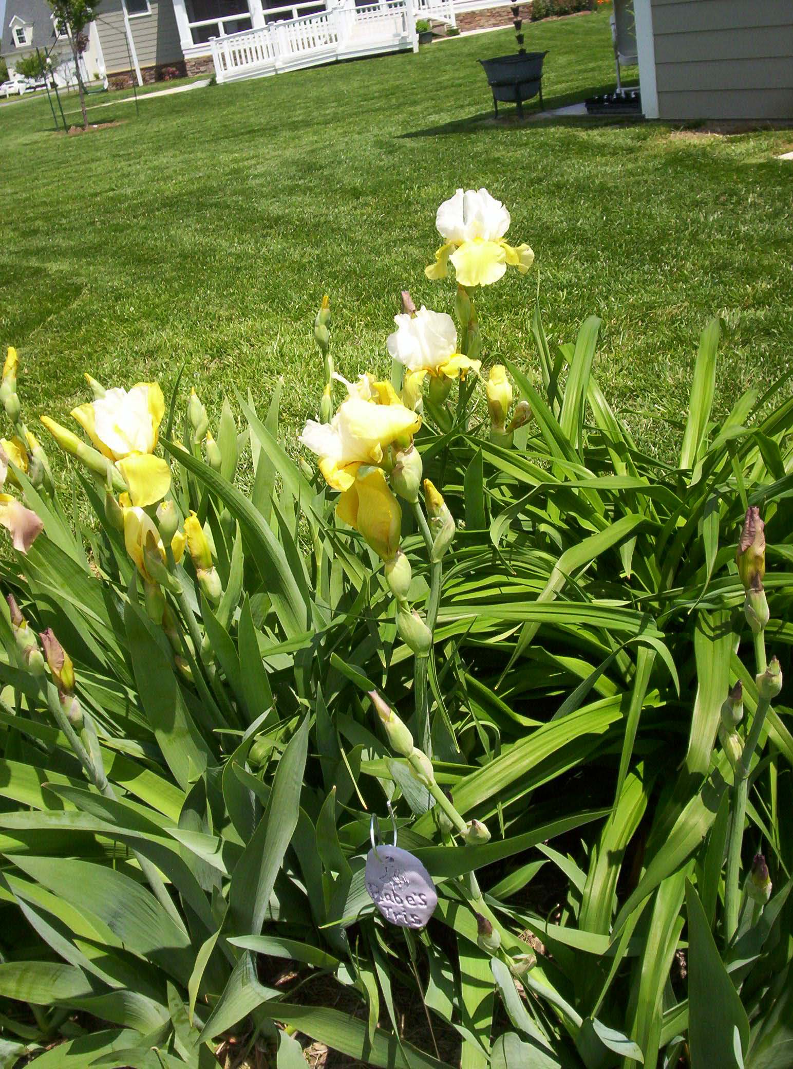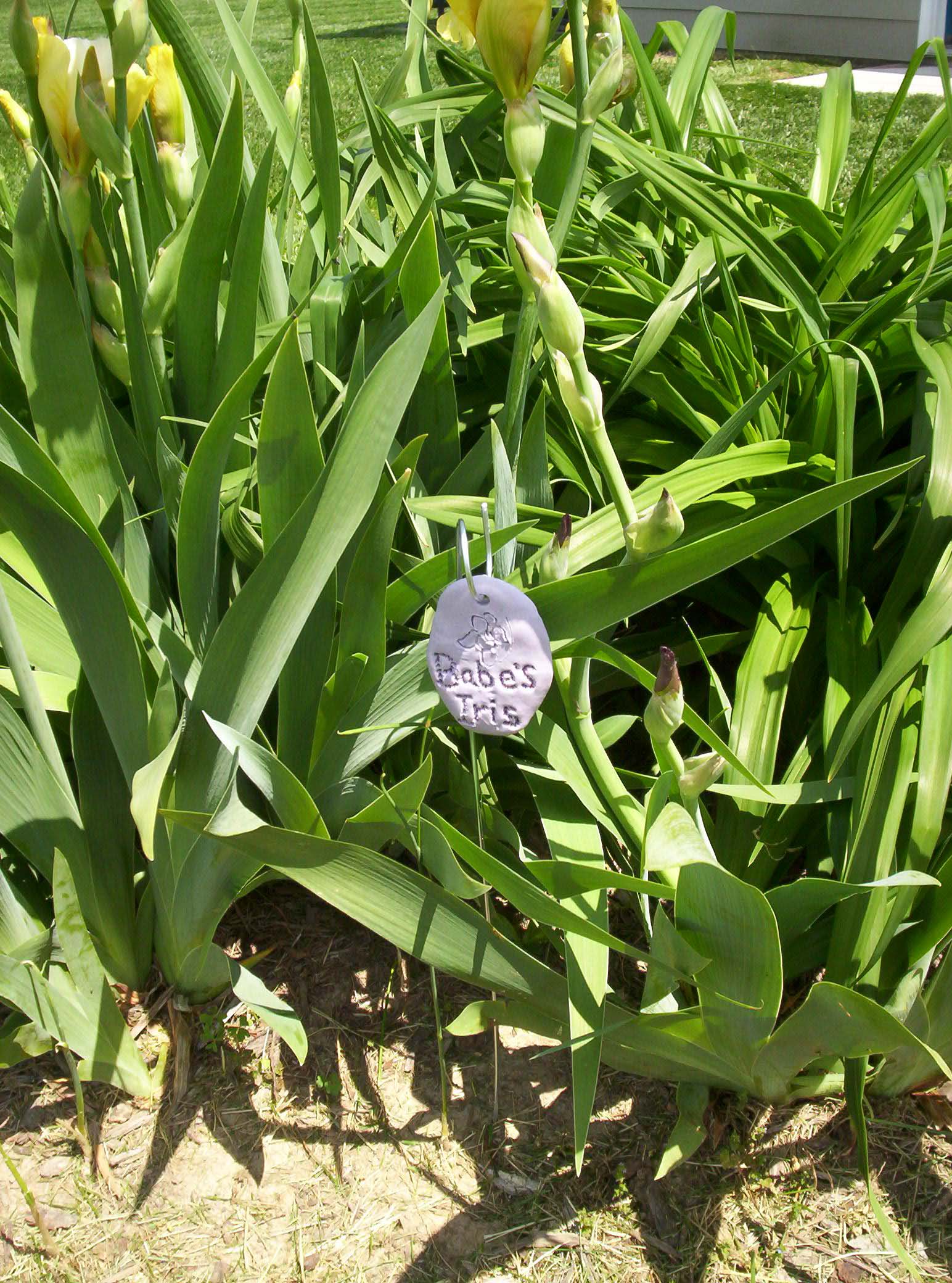 The blue Dutch iris are from Babe's garden -- the yellow bearded iris to the left came from a neighbor whose iris were multiplying. The following photos are of Babe's yellow and white bearded iris. Note the garden marker "Babe's Iris." This was a Christmas gift in 2010 from Joe's brother John and his wife Becky -- the marker is handmade and is quite a splendid addition to the garden.