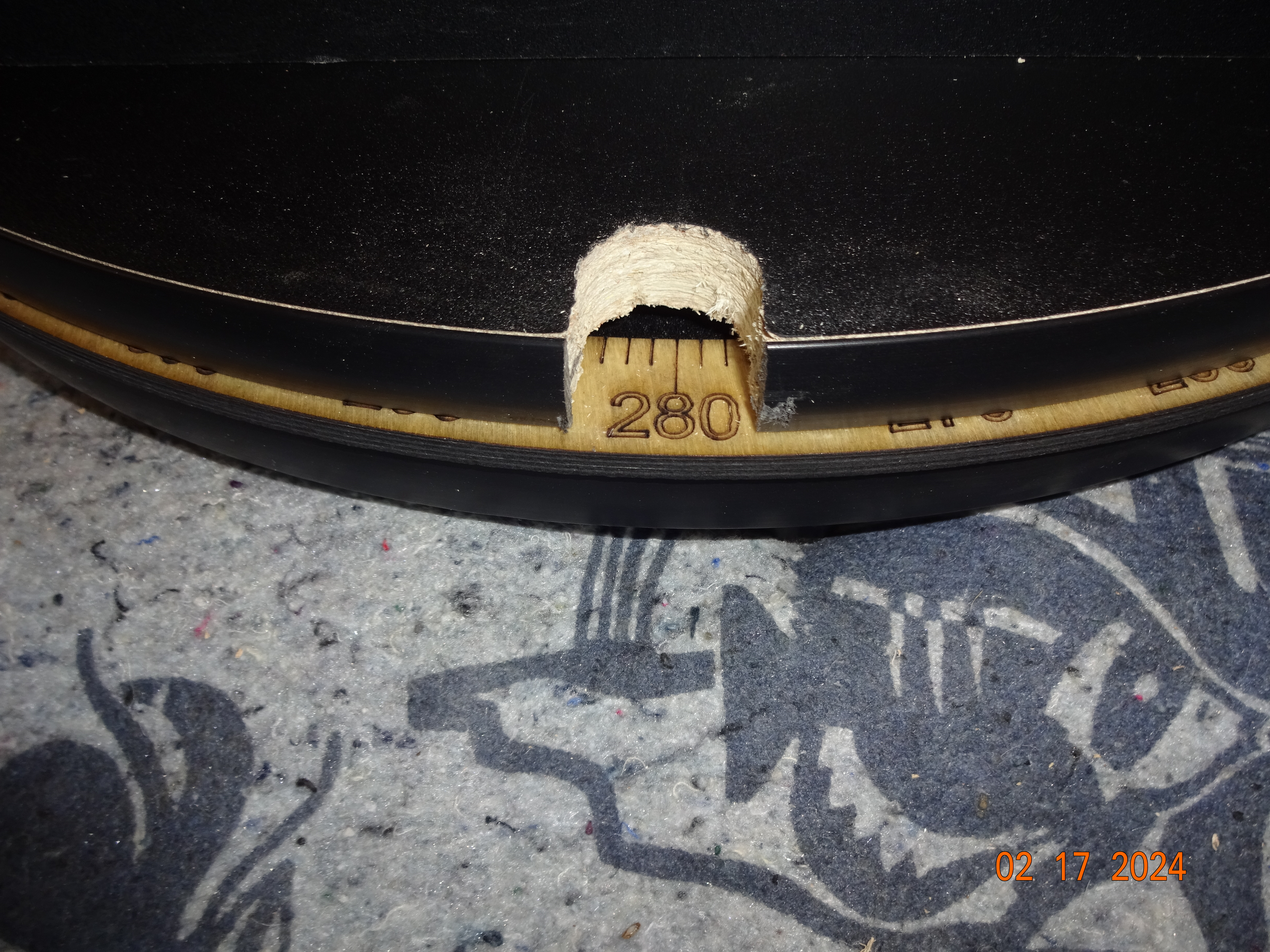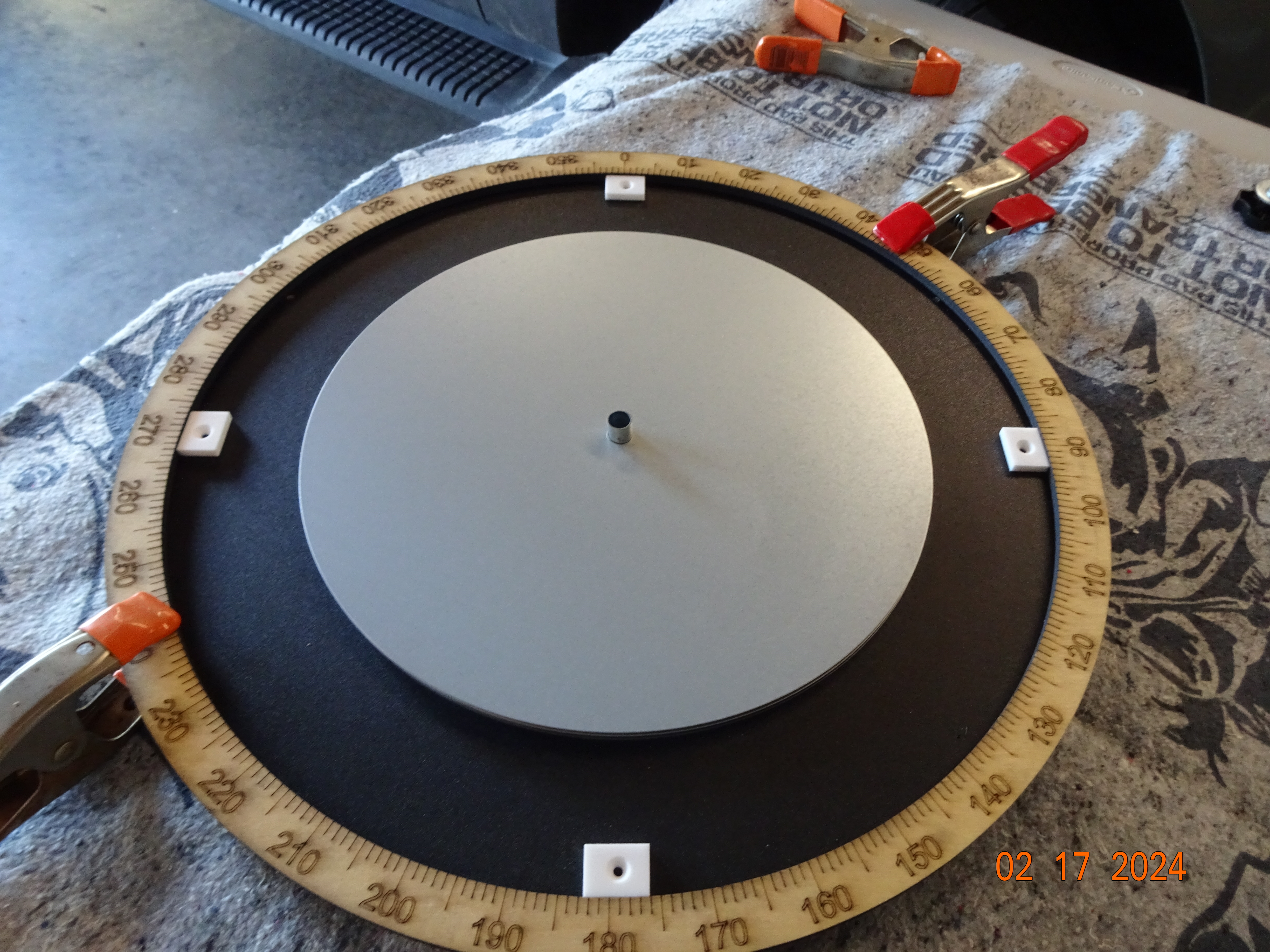 This photo shows for 5mm Teflon pads I had left over from another project. I laid them evenly around the inside of the circle to (1) hold it in place and (2) put friction on the circle so, after I set it, it would stay in place until I moved it. The circle hangs over the ground board about 1/8 inch, which is enough for me to grip it and move it.