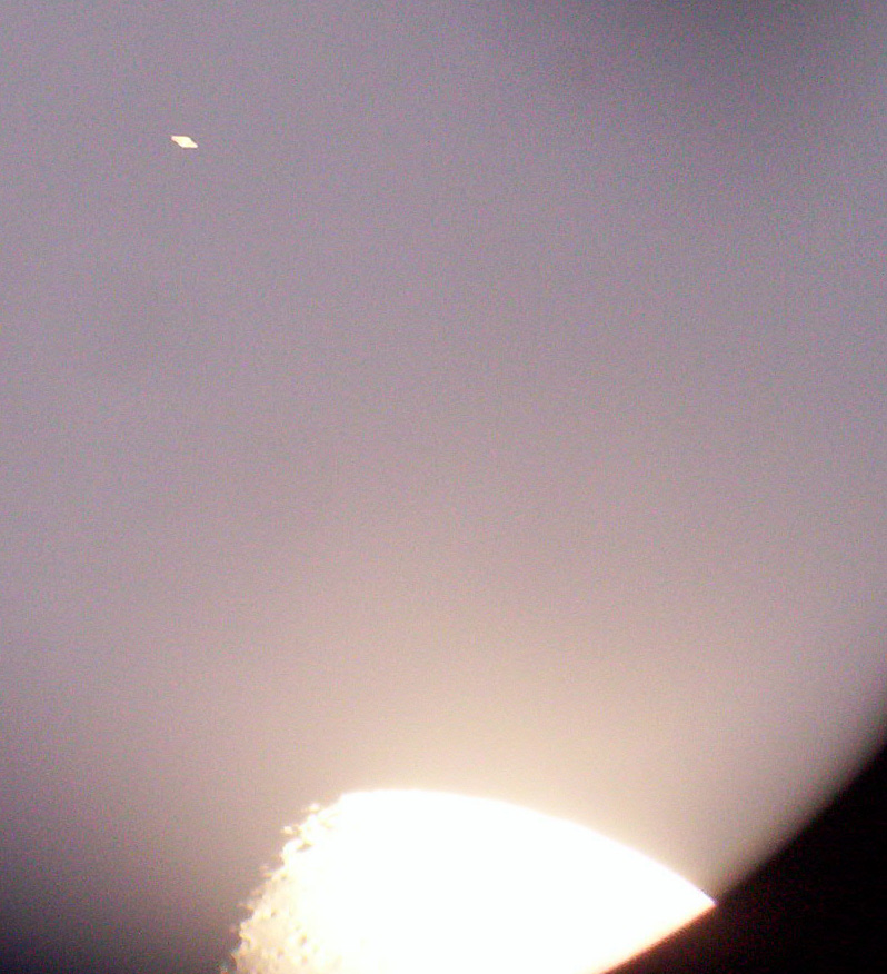 Saturn with its rings is visible in the upper left corner while the Moon dominates the bottom half of the photo. These photos were taken through a reflecting telescope, thus, the image is reversed from reality -- as seen from Earth, Saturn was beneath the Moon -- the scope's mirror reverses that position.