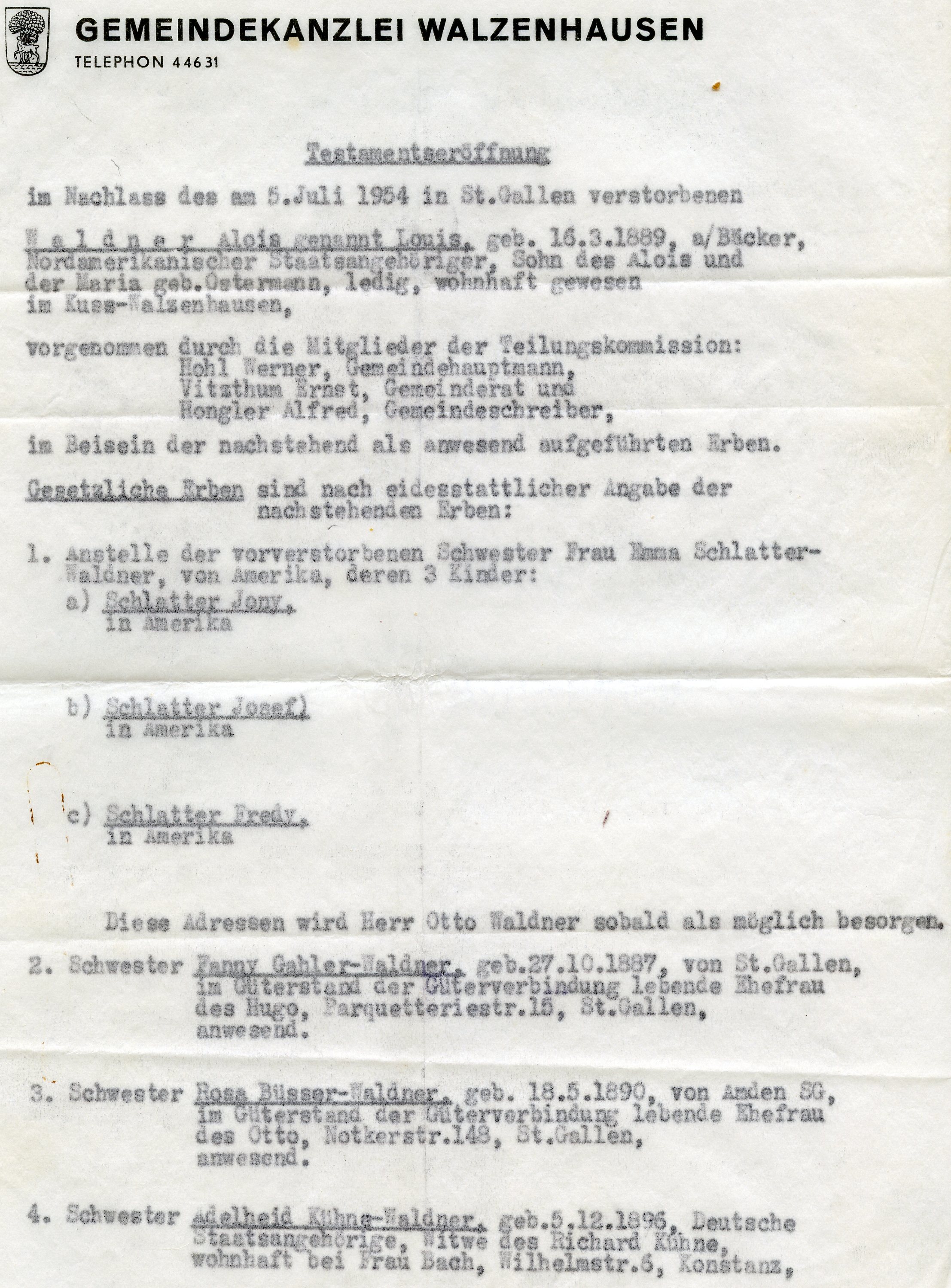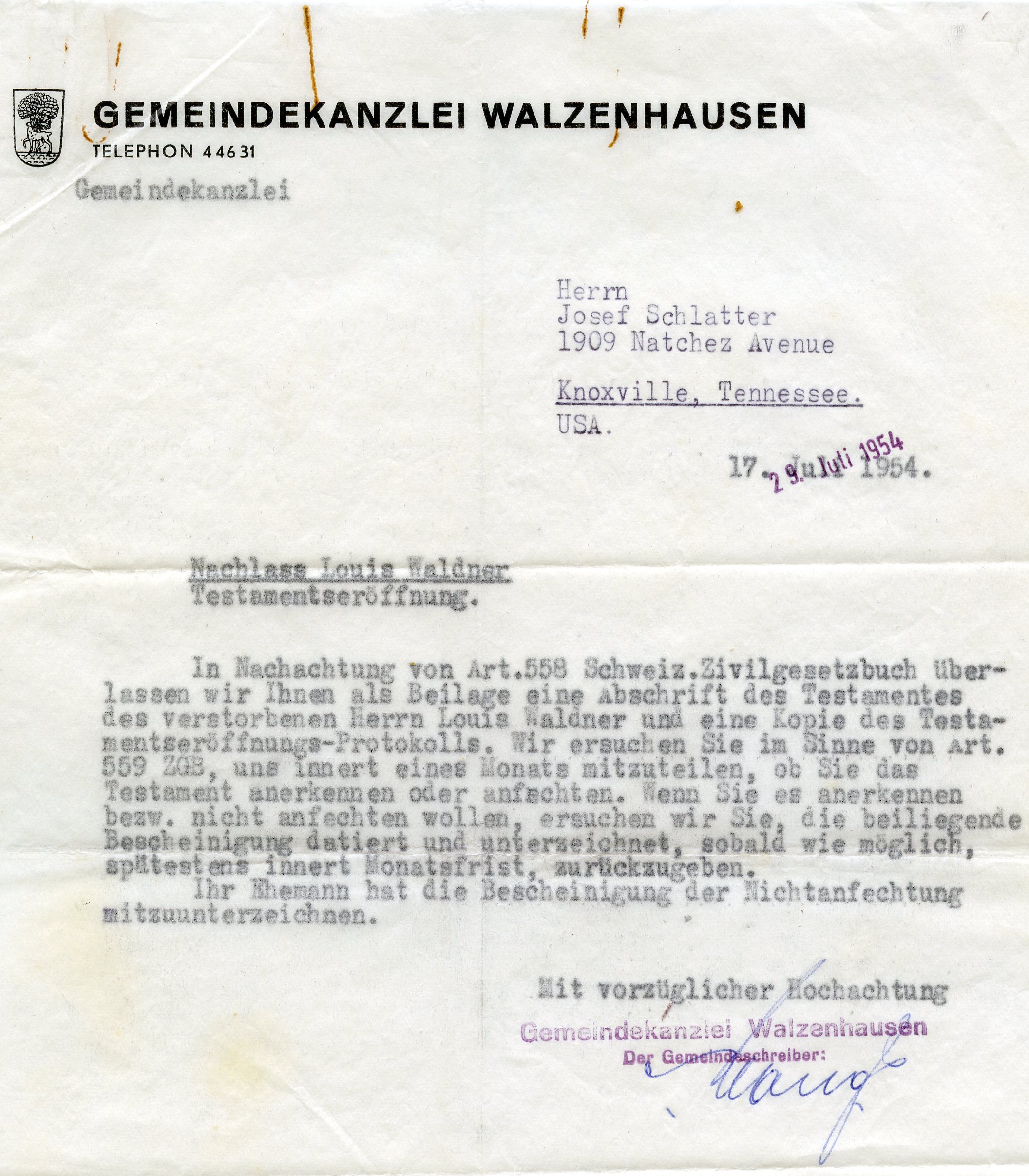 Most of the information we have about the Waldner family comes from a letter written to my father after Louis' death in 1954. Louis returned home to Switzerland sometime in the early 1950's; possibly the late 1940's. He died in July 1954 and, when his estate was settled, an attorney in Switzerland sent a letter to all family members. My father and his brothers, John and Fred, were Louis' nephews -- sons of Louis' sister Emma. We lived in Knoxville, TN, when this letter arrived -- my father is the "Herrn Josef Schlatter" to whom the letter is addressed. The following photos are of the letter; the letter lists: