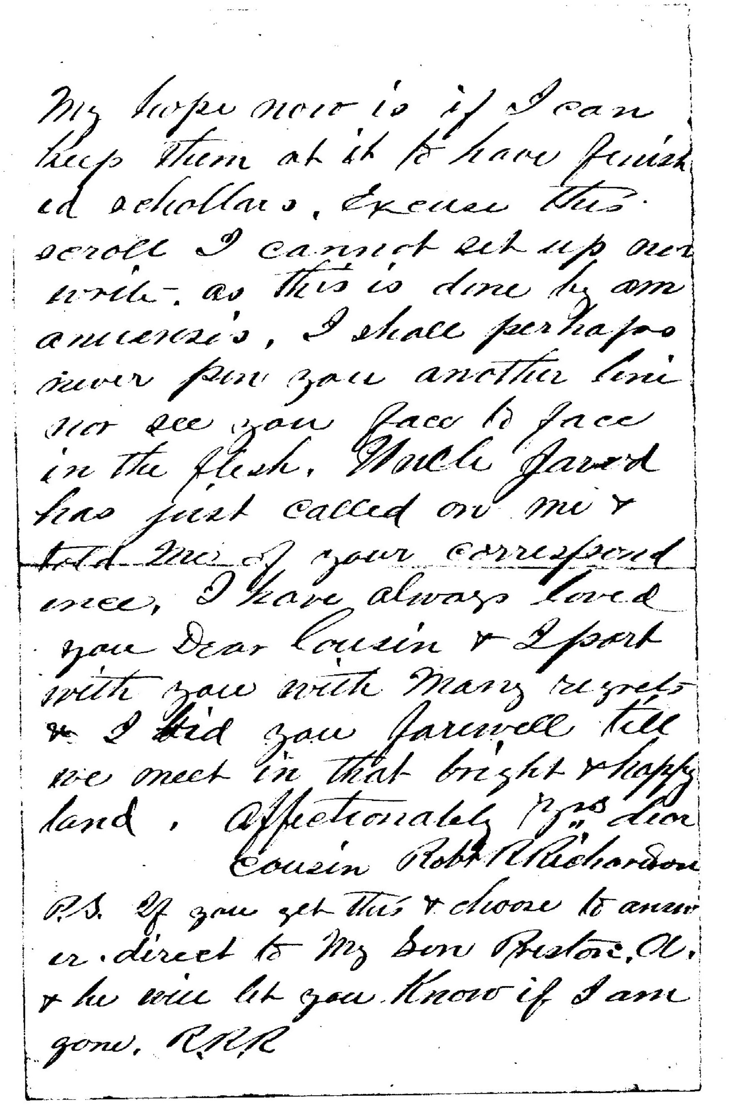 Jackson La Hon. F. D. Richardson My Dear Cousin, Nothing but procrastination has prevented me from writing to you for a long time. I exceedingly neglect & apologize for neglect. I’ve no news special to communicate to you. I’ve purchase & moved to this place as a family residence. I was prompted to do this for the purpose of educating my children (illegible). I could not do at the old homestead. I fear it has been a bad move for me as I did not anticipate the expenses and incidentals. It is certainly great satisfactions to have good schools. My hope now is if I can help them at it to have finished scholars. Excuse this scroll I cannot set up nor write as this is done by (three words illegible, may be “? ? nurse’s). I shall perhaps never pen you another line nor see you face to face in the flesh. Uncle Jared has just called on me & told me of your correspondence. I have always loved you Dear Cousin & I part with you with many regrets. I bid you farewell till we meet in that bright & happy land. Affectionately yrs dear P.S. If you get this & choose to answer direct to my son Preston(??) & he will let you know if I am gone. R.R.R.