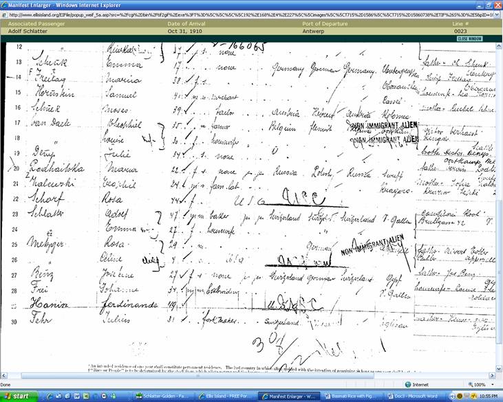 copy of the passenger manifest showing the entry of Adolf and Emma Schlatter