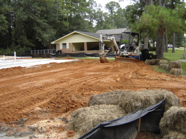 house slab. The excavator is grading the
