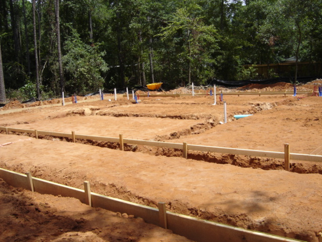 Here are photos. In this picture, you see: (1) the wooden forms that will contain the wet cement as it is poured to make the slab. (2) The footers -- these are the long trenches running front to back and side to side. (3) The plumbing. The waste pipes are the white PVC pipes sticking up here and there and the supply lines are the red and blue pipes sticking up. The supply lines are schedule K copper tubing, 3/4-inch diameter, with red or blue vinyl sleeving pulled over the copper tube to keep the copper out of contact with the dirt and the concrete. The large light-blue-green pipe partially visible just to the right of center is the main waste water line -- it runs from the right side of the house to the left side and all the smaller waste lines feed into it. This line then runs to the sewer connection at the street.