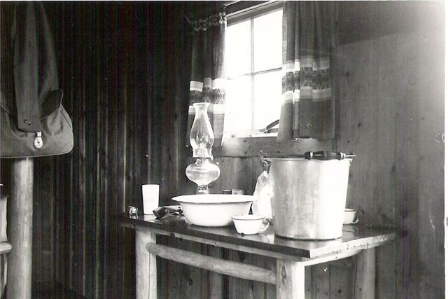 shown here with a kerosene lamp, wash basin, bucket to get water from the