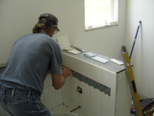 Here's Jim at work -- he is standing in the bathtub installing tile around