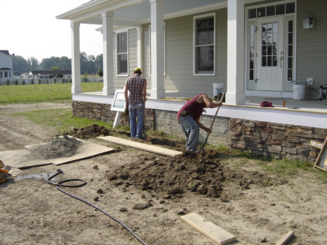 concrete into this trench and set three anchor bolts in the concrete; steps will