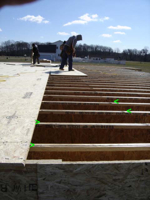 have inserted green arrows, you will see laid on top of each floor joist is a