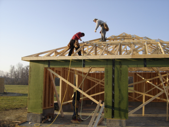 This photo shows a crew working on the garage trusses.