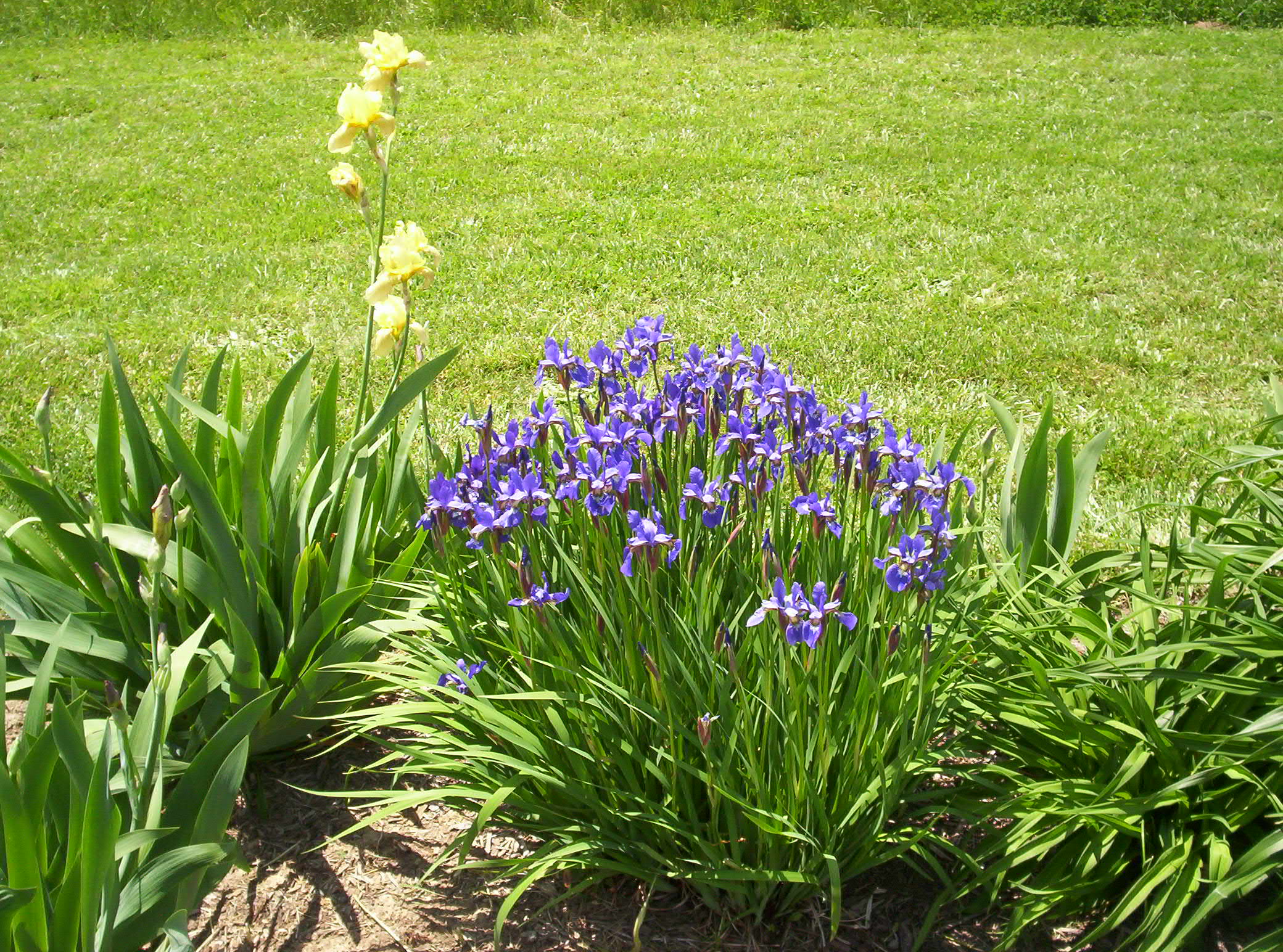 The blue Dutch iris are from Babe's garden -- the yellow bearded iris to the left came from a neighbor whose iris were multiplying. The following photos are of Babe's yellow and white bearded iris. Note the garden marker "Babe's Iris." This was a Christmas gift in 2010 from Joe's brother John and his wife Becky -- the marker is handmade and is quite a splendid addition to the garden.